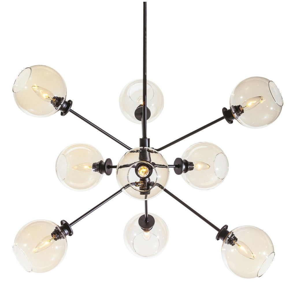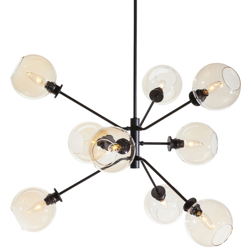 The Atom pendant projects a smart contemporary dynamic. Featuring 9 glass orbs on articulated multi-directional arms, the Atom is a unique urban pendant expressing a sophisticated modern energy. Suspended on a powder coated steel canopy, the Atom is adjustable to a maximum overall height of 47 and a half inches.