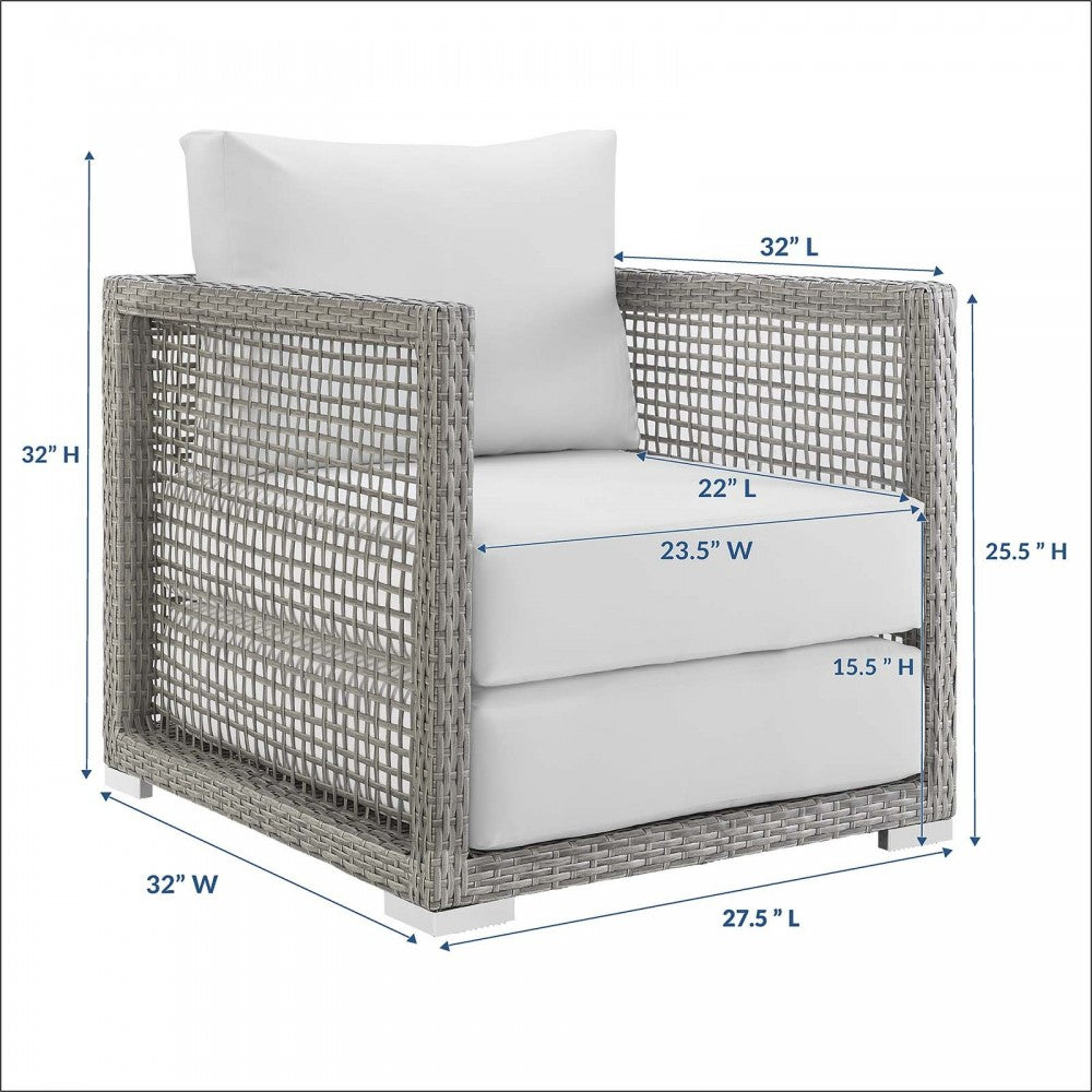 Weave conversational threads into a rollicking good time with Aura Outdoor Patio Armchair. Aura comes with a synthetic gray-on-gray tone wicker rattan weave and a powder-coated aluminum frame that delivers a softly versatile outdoor collection that shifts to meet the needs of the moment. Outfitted with machine washable and fade resistant all-weather fabric cushions, and designed with an extra wide and deep body, Aura will make your outdoor spot the focal point of good memories and festive gatherings while enhancing your patio, backyard or poolside arena. Featuring thick cushions and chrome plated anti-skid feet, enjoy spacious seating and enhanced comfort with this reliable piece of outdoor furniture. Comes fully assembled.