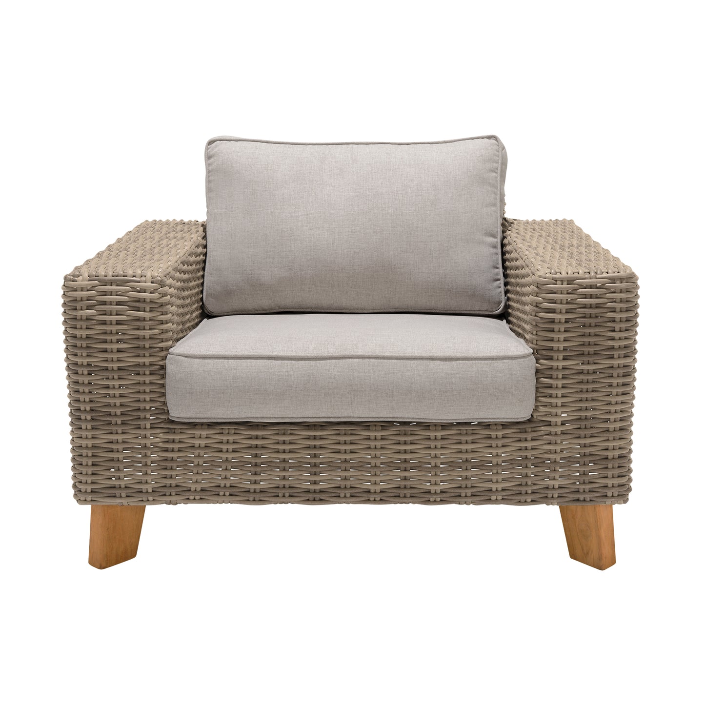The Bahamas Outdoor Wicker & Teak Wood Lounge Chair with Beige Olefin from Armen Living will absolutely enhance the beauty of any outdoor space. The amazing look of the Bahamas chair will be a great addition to your outdoor or indoor living area. The cushions are upholstered in olefin fabric which is perfect for the outdoors because it is abrasion, stain, sunlight, fire, and chemical resistant. The teak legs are sturdy and dependable, staying strong against most elements. The unique wicker is a combination of raw polyethylene and eco-friendly colorants which is 100% recyclable and environmentally friendly. The flared legs are made from FSC certified teak wood that has been sourced and recycled from components and structures on the island of Java and serves as a strong support system for you to enjoy for many years to come. The convenient zipper closure on the cushions allows you to remove the covers for easy clean up. Pair this chair with the Bahamas Outdoor Wicker & Teak Wood Sofa with Beige Olefin or the Bahamas Outdoor Rectangular Teak Wood Coffee Table from the same collection! Product Dimensions: W:44 x D:35 x H:28 x SH:19