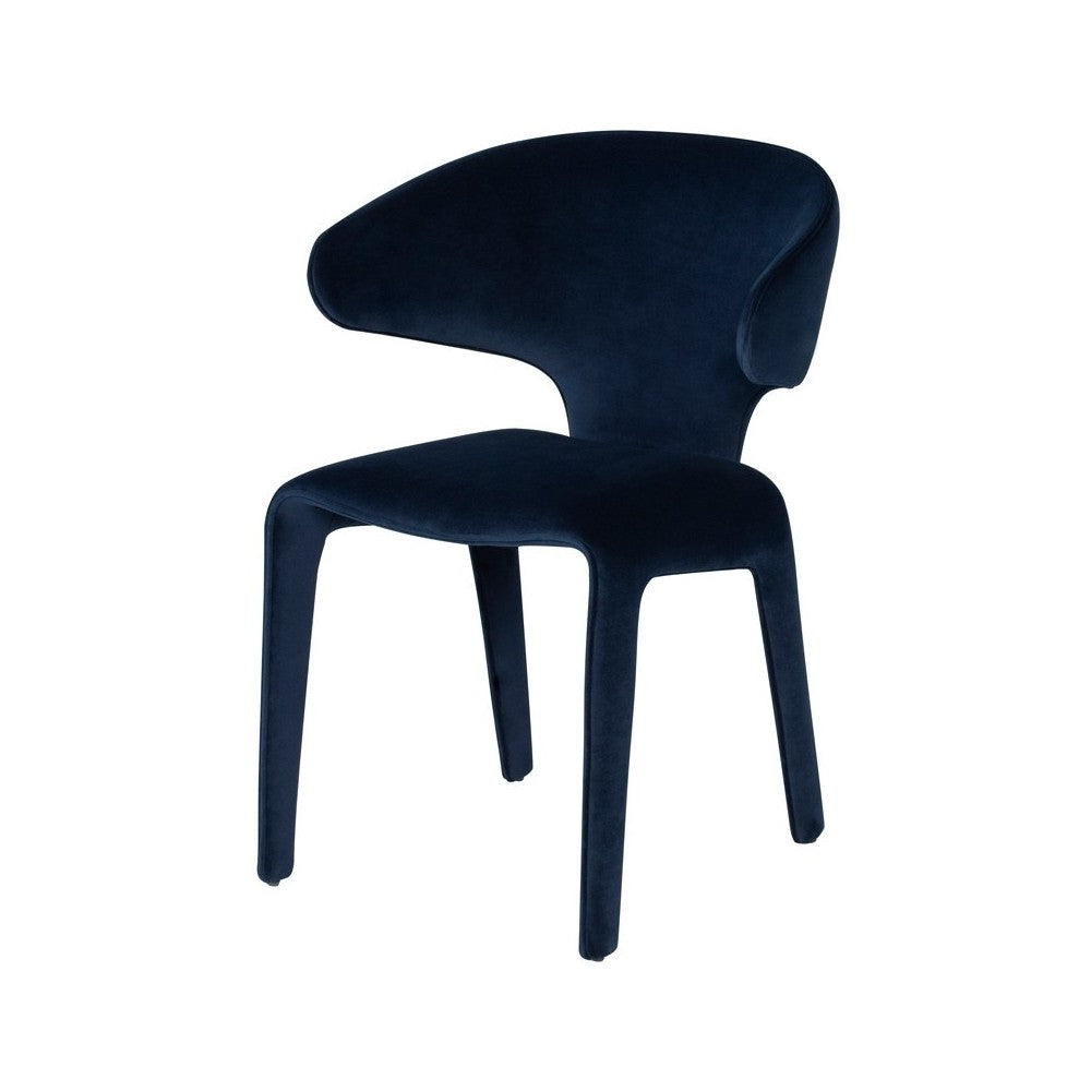 The fluid lines of the Bandi dining chair create a soft and organic addition to any dining room. In rich velour, the gently curved back makes a graceful statement from behind. Its beautifully constructed with sturdy, upholstered legs and a shapely design.