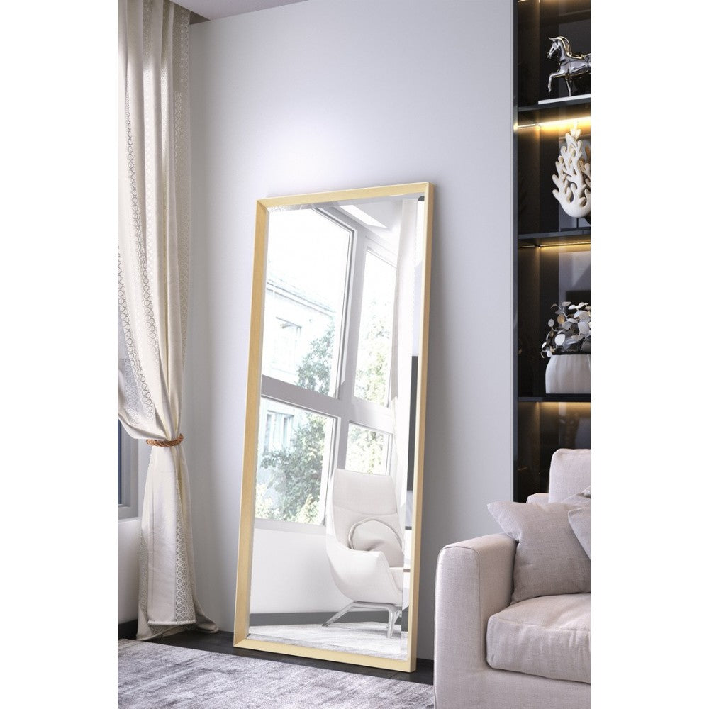 Avalon floor Mirror has a shiny gold leaf finish with a deep molding profile and beveled glass.