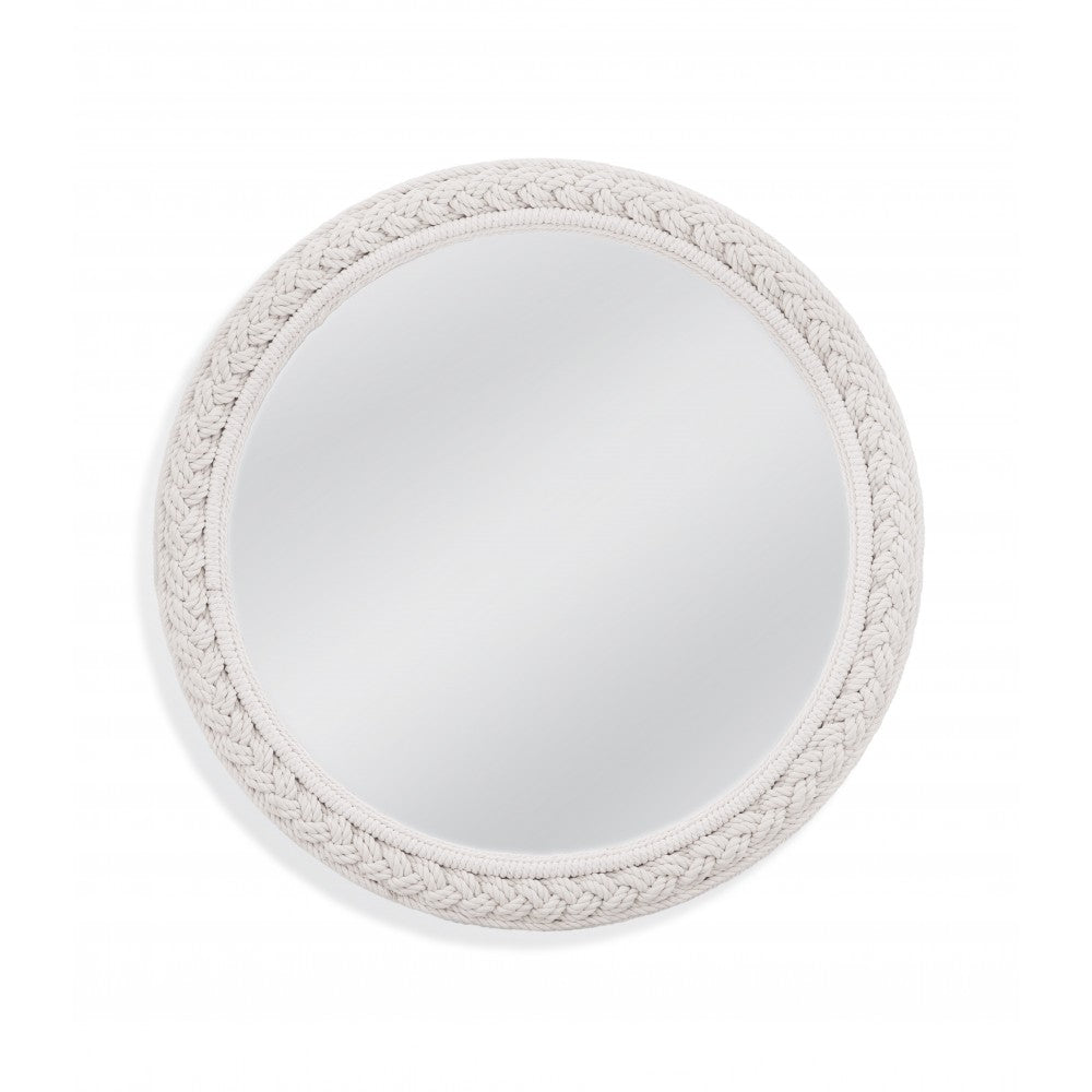 The Island Wall Mirror is round with a white braided rope frame and beveled mirror glass.