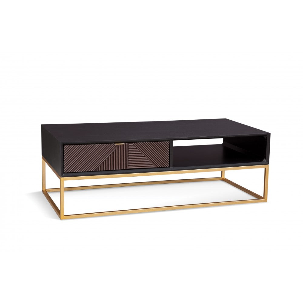 Perched upon a gold angular metal frame is the Beadier Cocktail Table. The cocktail body has an open through shelf and one drawer on each side with the drawer front featuring a ridged angled drawer face motif and gold linear drawer pulls. Adjustable floor levelers.