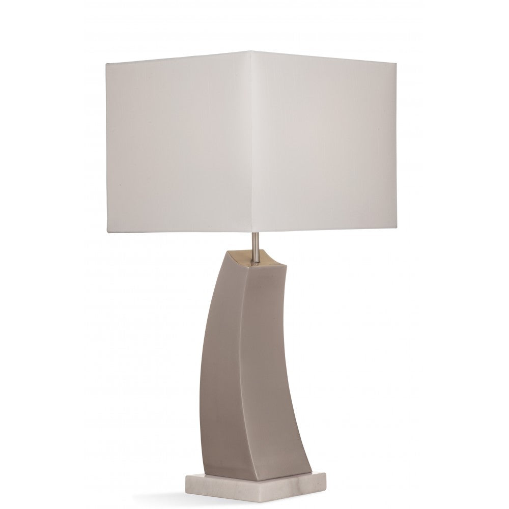 The Braden Table Lamp is a modern design finished in brushed steel with a white marble base. It is paired with a square white linen shade.