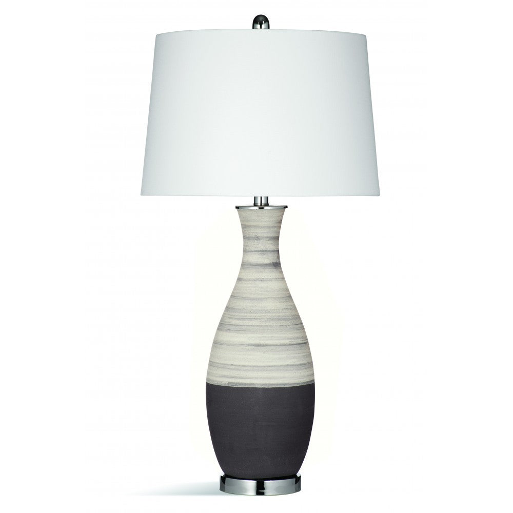 The Cassia Table Lamp is crafted of ceramic in a black and Gray finish with a white fabric tapered shade.