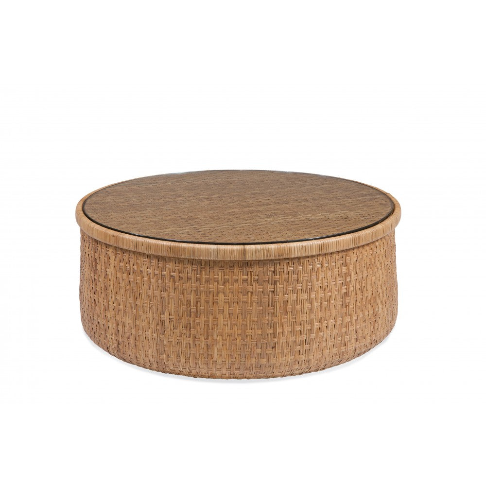 The Clary Cocktail Table is round made of a rattan peel featuring a glass top and casters.
