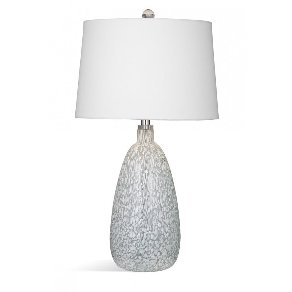The Clayton Table Lamp is crafted of Art Glass in a blue glass finish with a white linen tapered shade.