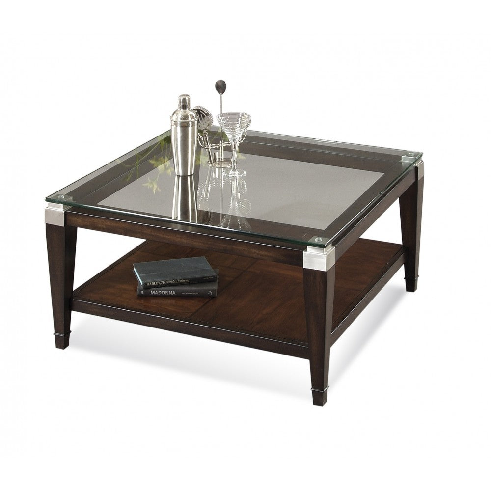 The Dunhill Square Cocktail Table combines the modernity of brushed nickel and glass with richly finished oak and walnut to deliver bold visual impact. Floating thick glass tops and parquet shelving show off your objects d'art and coffee table books.
