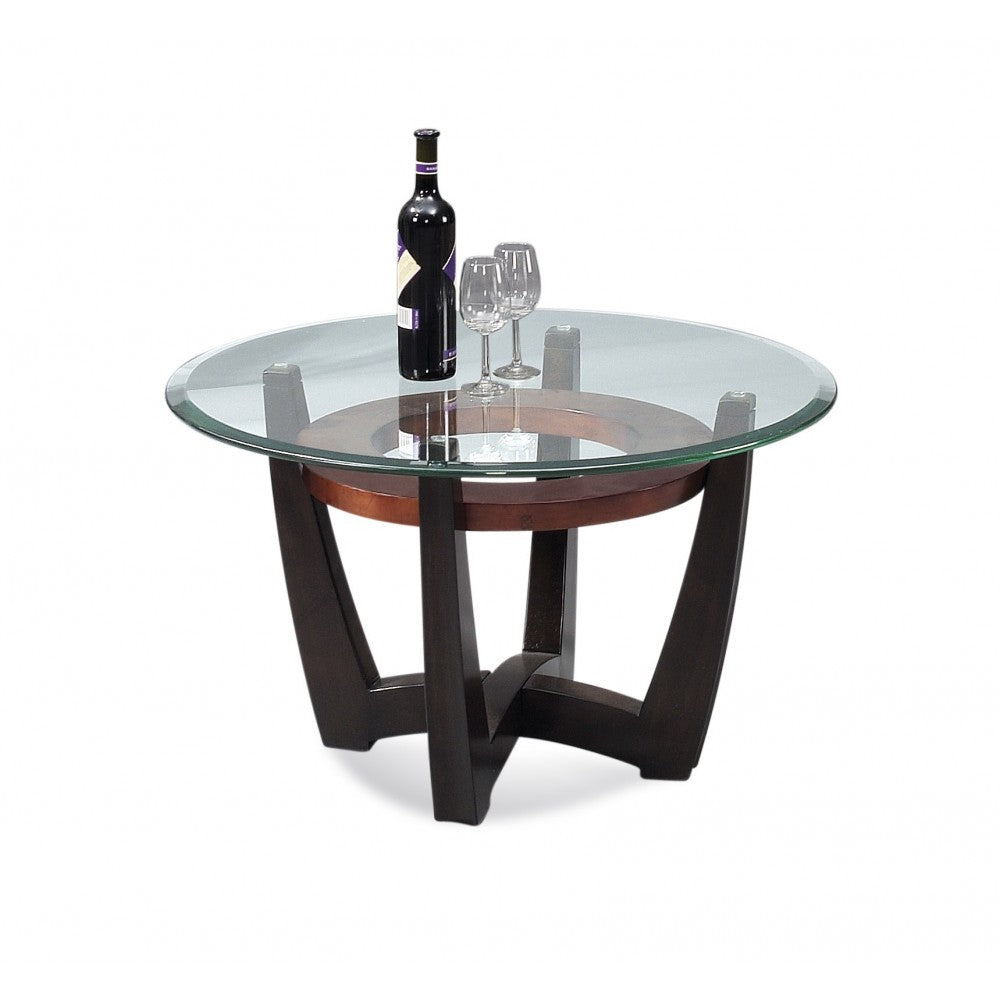 The Elation Round Cocktail Table provides clean contemporary styling. Asian hardwoods are finished in rich cappuccino and tasteful antiqued copper leaf and configured using gently curved surfaces that create Elation's sophisticated sensibilities. The thick, scratch resistant 3/8 glass top features a polished beveled edge detail.