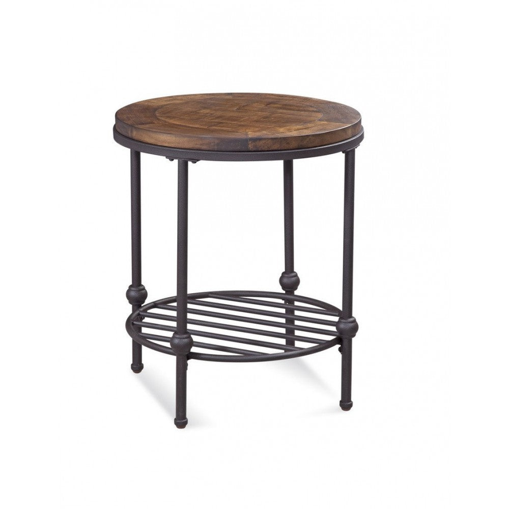 The Emery Round End features a pine top finished in a rustic barnside and the metal base is finished in gunmetal. A spoke shelf below creates additional storage function.