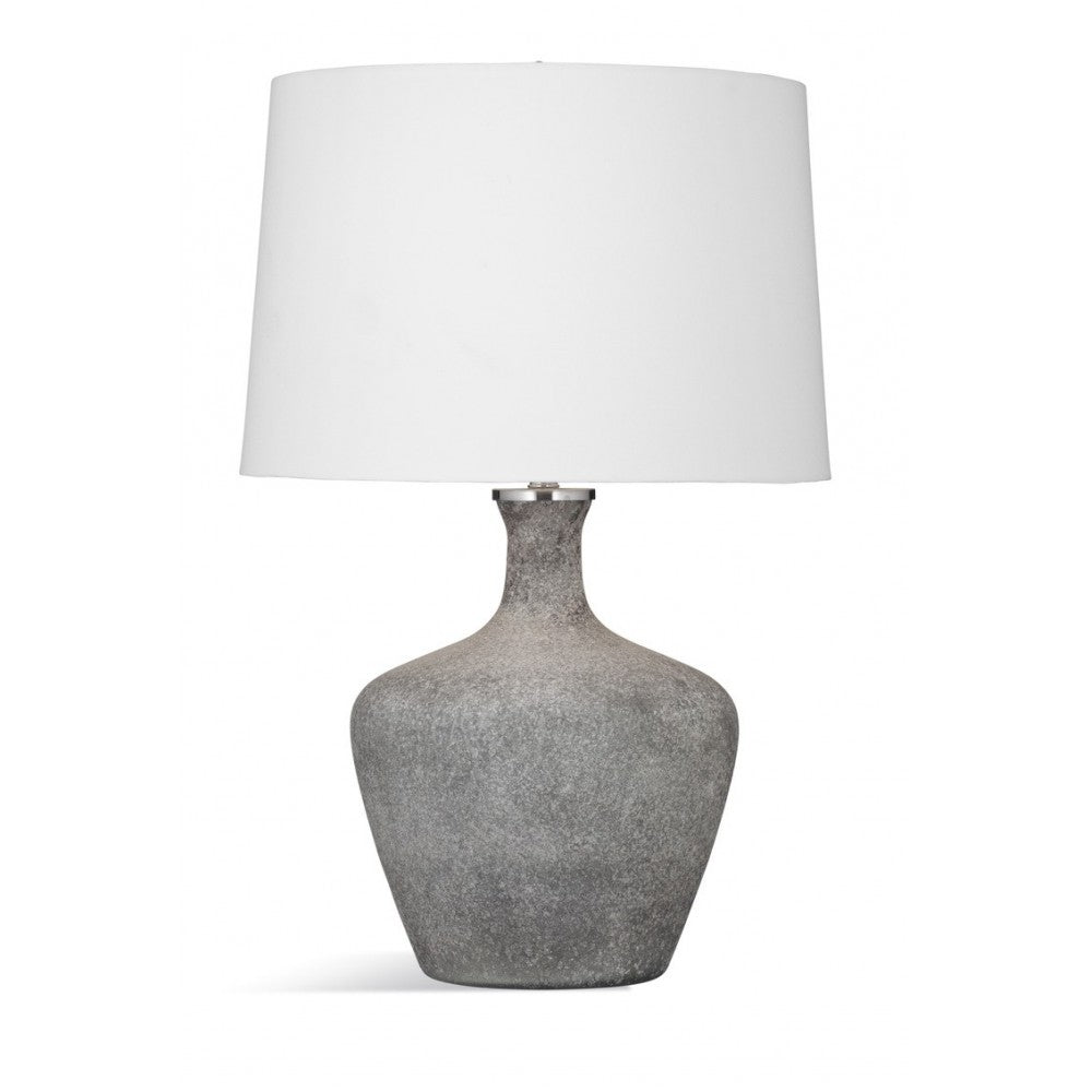 The Eva Table Lamp is crafted of Glass in a Textured Dark, Medium and Light Gray Finish with a white linen tapered shade