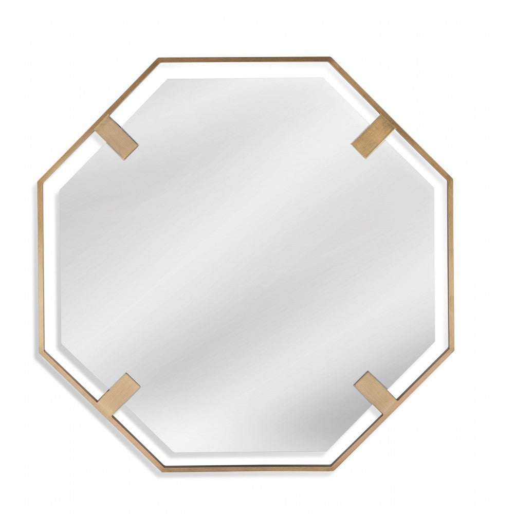 The Giorgio Wall mirror features an architectural metal frame finished in antique gold that suspends the mirror glass with four attachment points creating this dramatic effect.