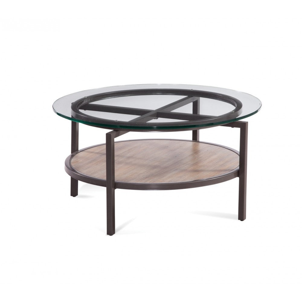 The Hannaford round cocktail table has a glass top supported by graphite metal base with an open circular top with an x motif bottom wood shelf banded in graphite metal.