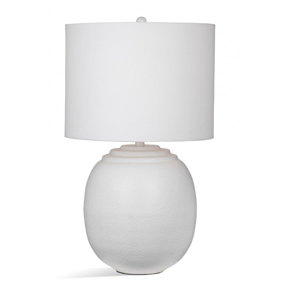 The Harrison Table Lamp is crafted of iron in a white powder coat finish with a khaki linen-like drum shade.