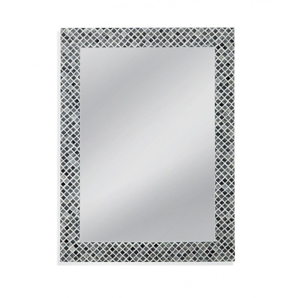The Henn Wall Mirror is a rectangular mirror with a scalloped lattice pattern frame in white and various shades and tints of gray.