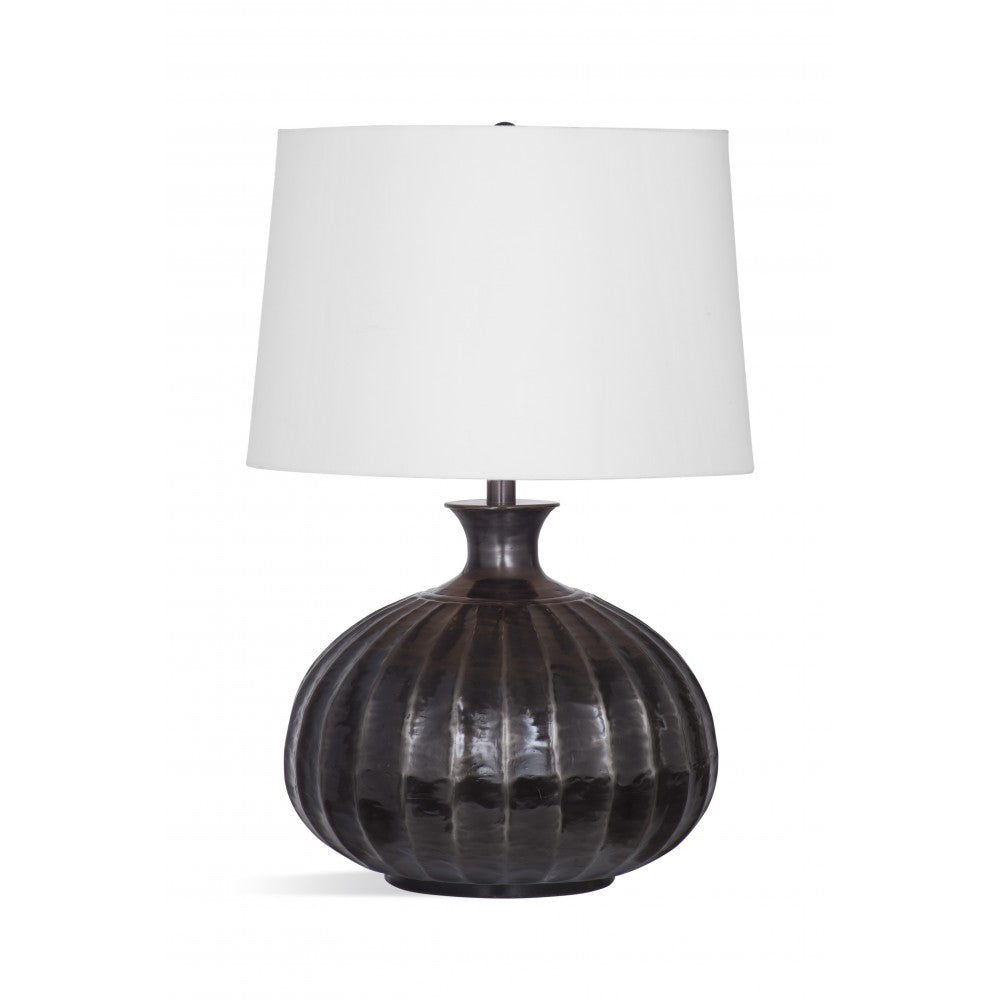 The Jaqueline Table Lamp features an antique silver gunmetal base with ridges hightlighted in copper with a white tapered shade