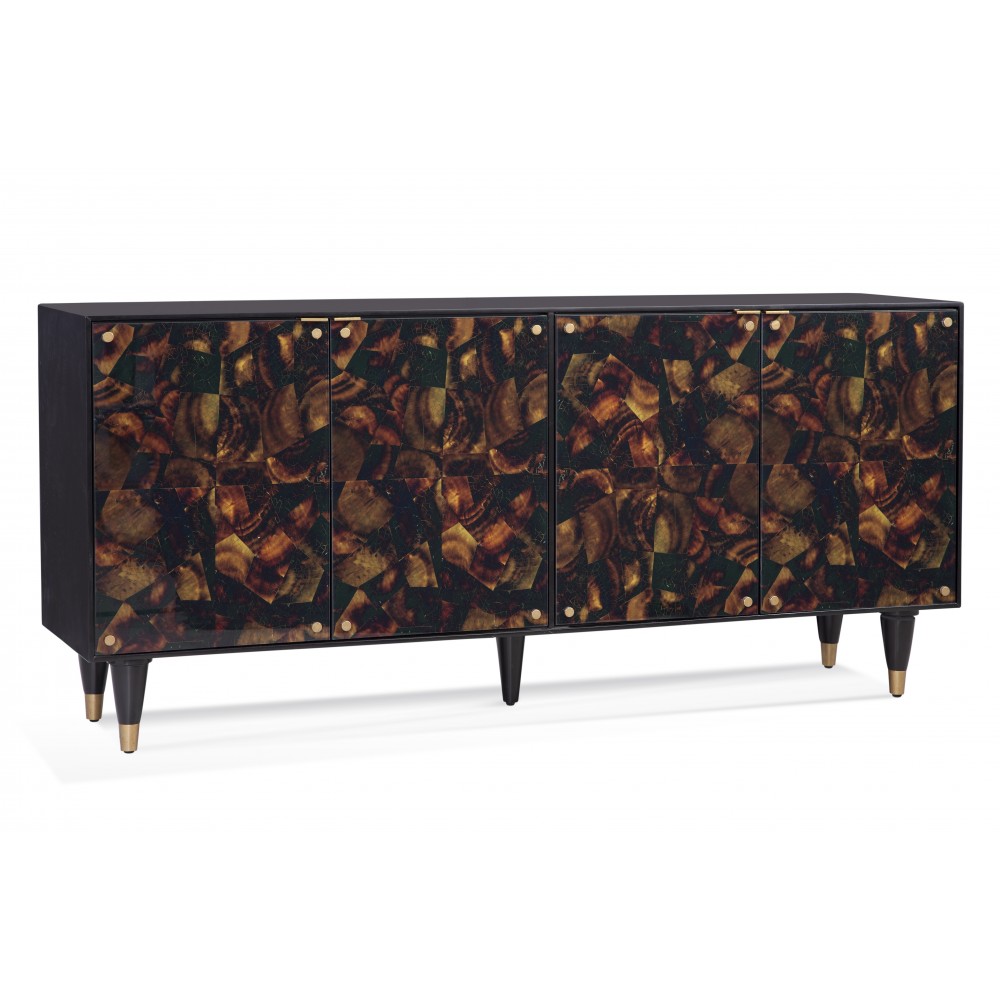 The Kendrick Server is enhanced by glass over a printed gold, brown and black pen shell image. This four door cabinet features beautiful brass rivets in each corner and discrete brass door pulls. The waterfall top, sides and tapered legs are in a black lacquered finish. The tapered cabinet legs are completed with brass metal tips.