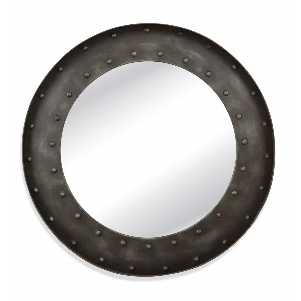 The Kirk wall mirror is reminiscent of something that might be found in an old factory. Its circular frame and antique metal finish provide any space with an industrial feel.