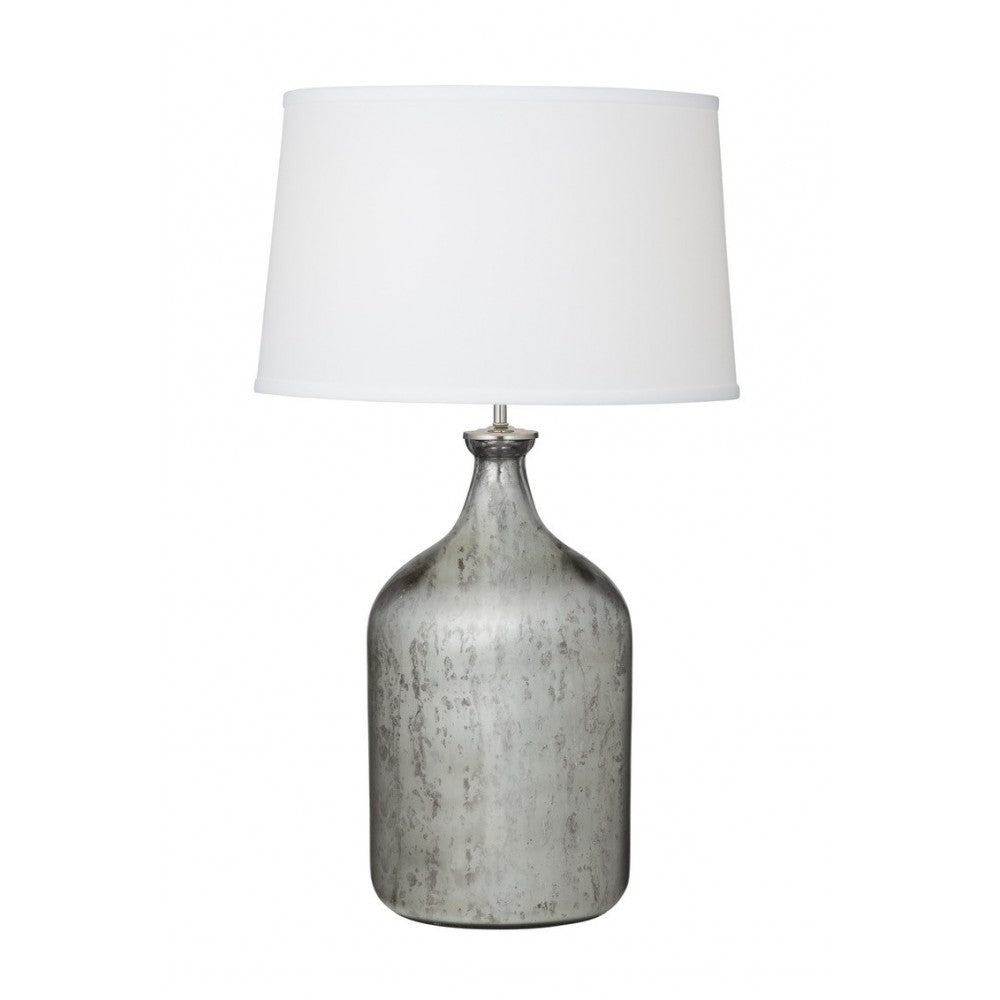 The Lindler Table Lamp is crafted of glass in an antique silver mercury glass finish with a white cotton tapered shade.