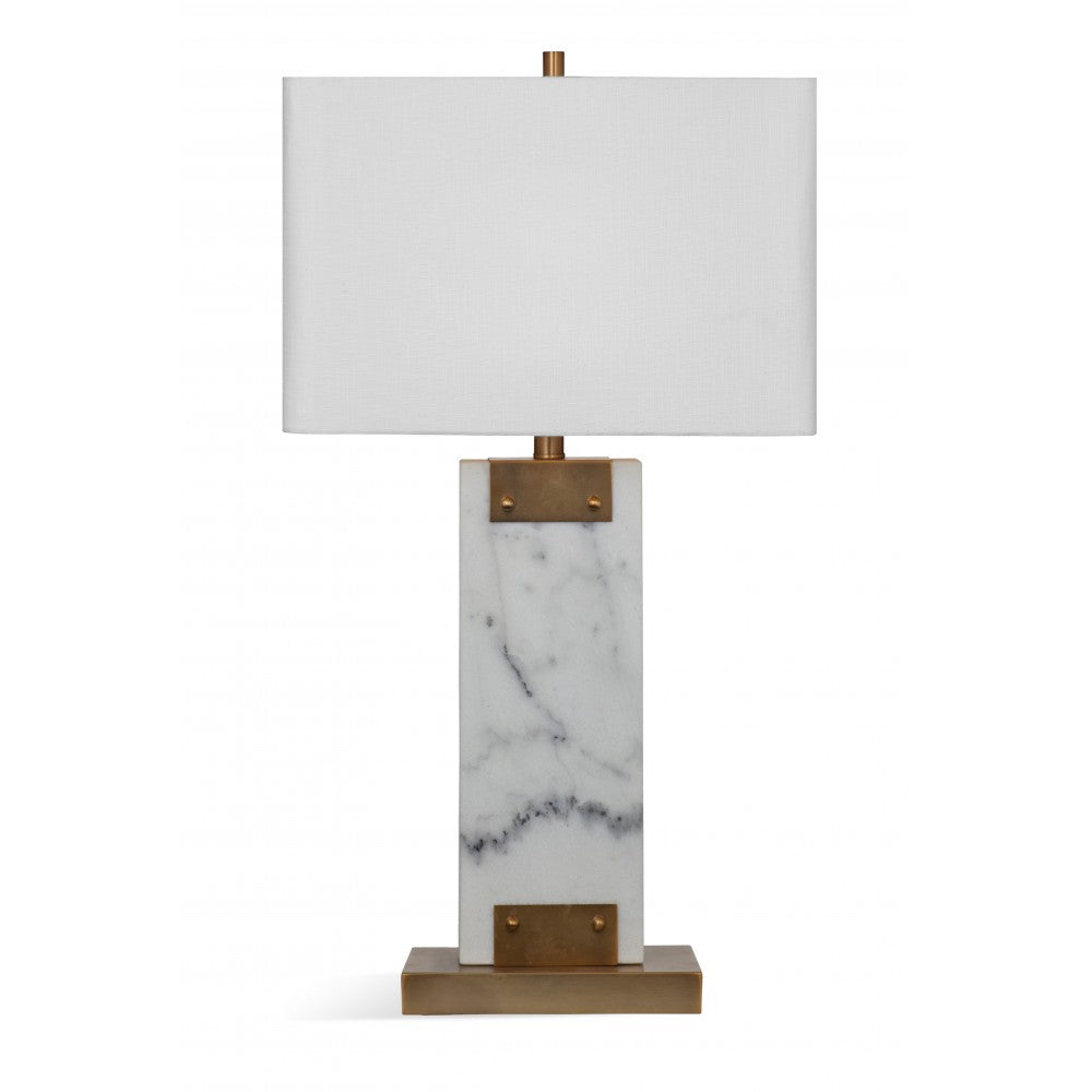 The Marra Table Lamp is crafted metal and white marble featuring a rectangular white linen shade.