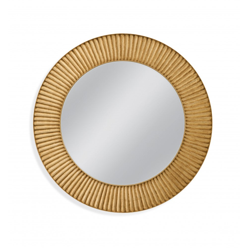 Midtown Wall Mirror is round with a 6" gold sunburst like frame.