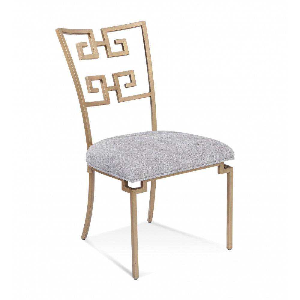 Add a dose of modern elegance to your dining space with the Milos side chair. Dazzling in a glazed brass finish with a smoky upholstered seat, this chair will accentuate any dining room.