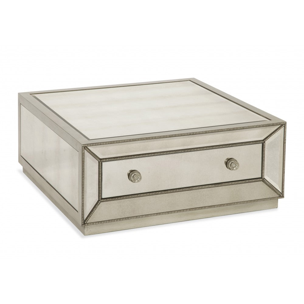 The Murano Square Cocktail Table delivers Old World Charm with a distinctive Modern Glam feel. Featuring antiqued mirror panels and silver leaf beading with shadowbox framing around the faces of the furniture.