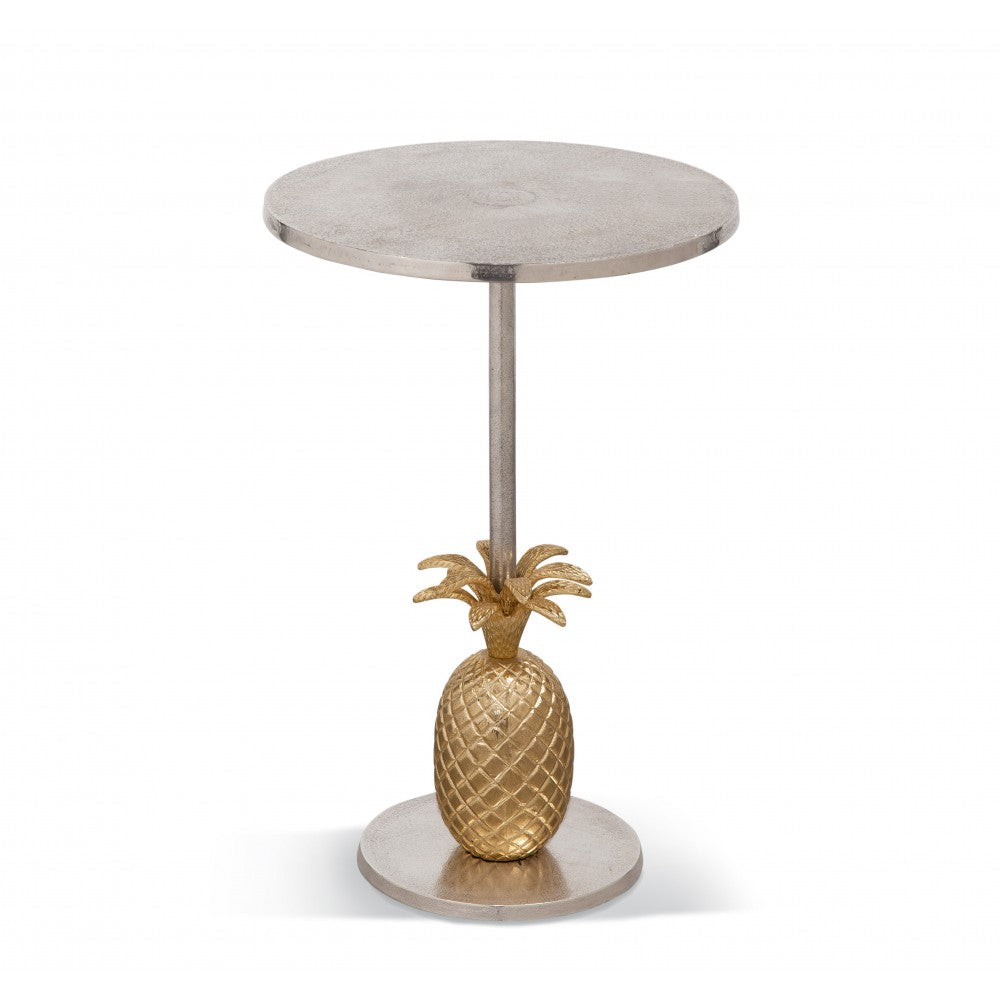 Palma Scatter Table features a nickel round top adorned with a gold pineapple base.