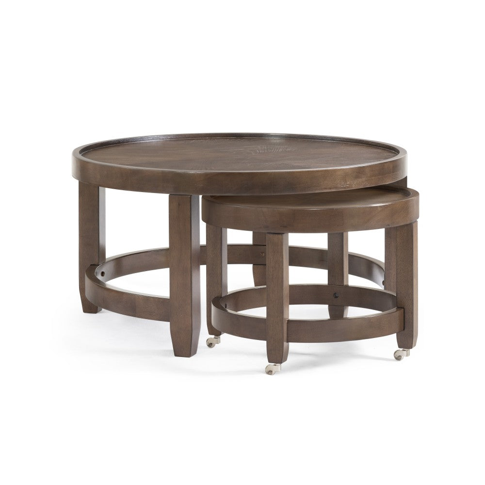 Casual, contemporary styling. Oak veneers finished in a nut-brown color. Bonus table on casters.