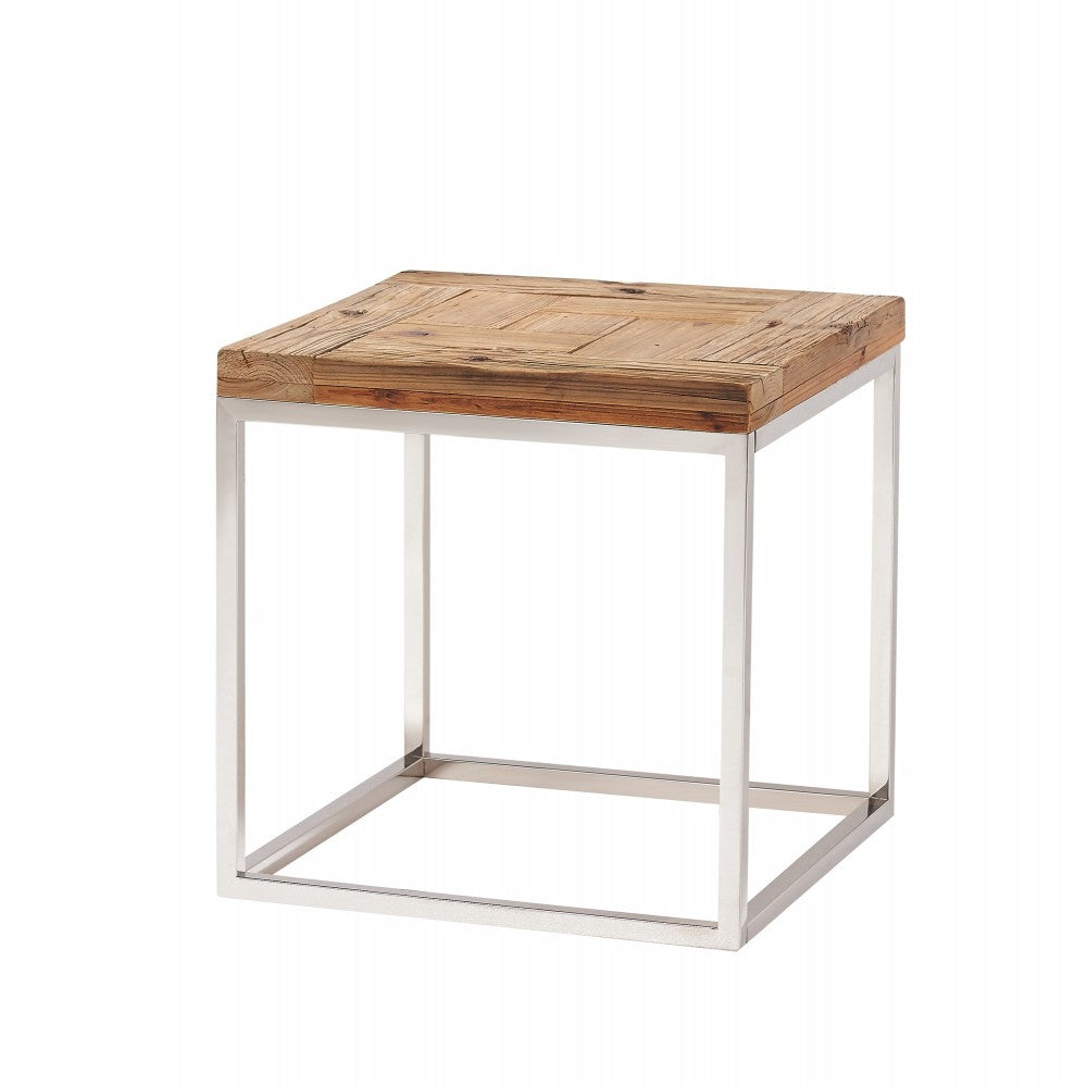 Boho lifestyle with contrasting rusticated fir and polished stainless steel base.
