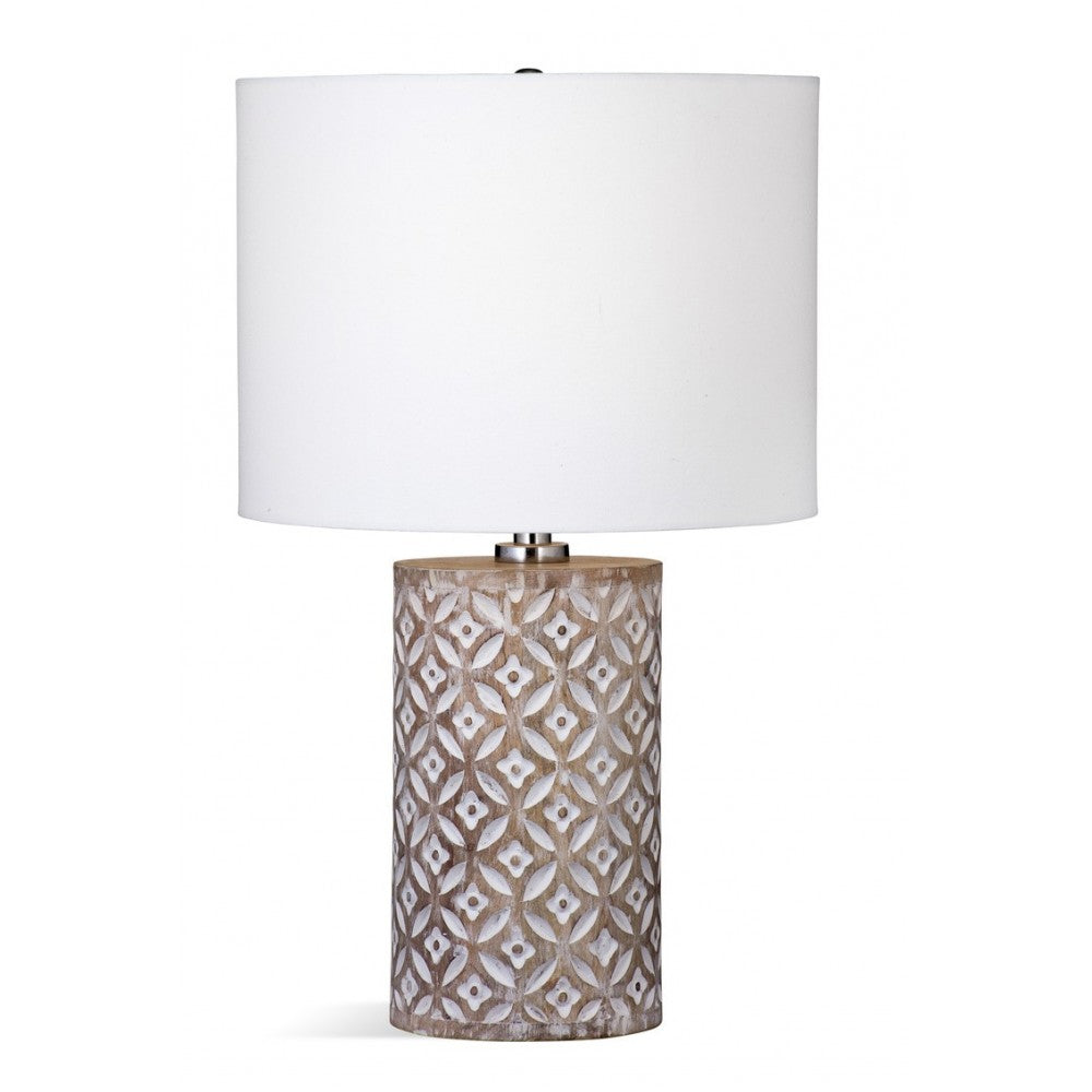 The Randolph Table Lamp is crafted of Mango Wood in a White Wash Finish with an ivory linen drum shade.