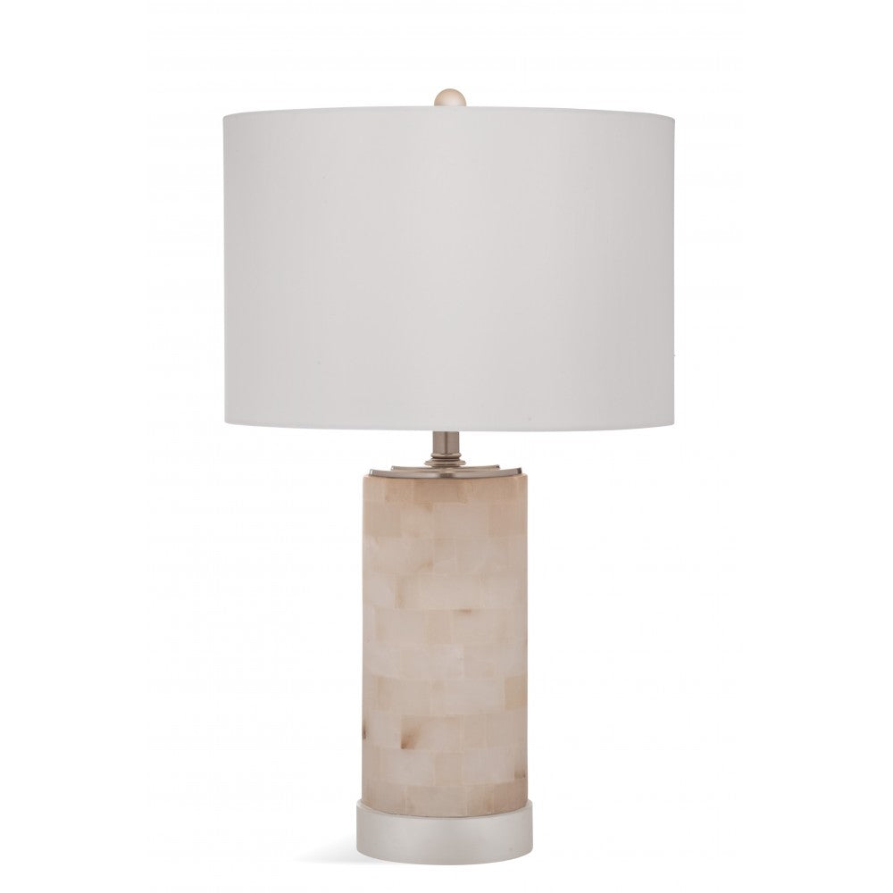 The Selen Table Lamp features a cylindrical alabaster body on a frosted crystal base. It is paired with a white linen drum shade.