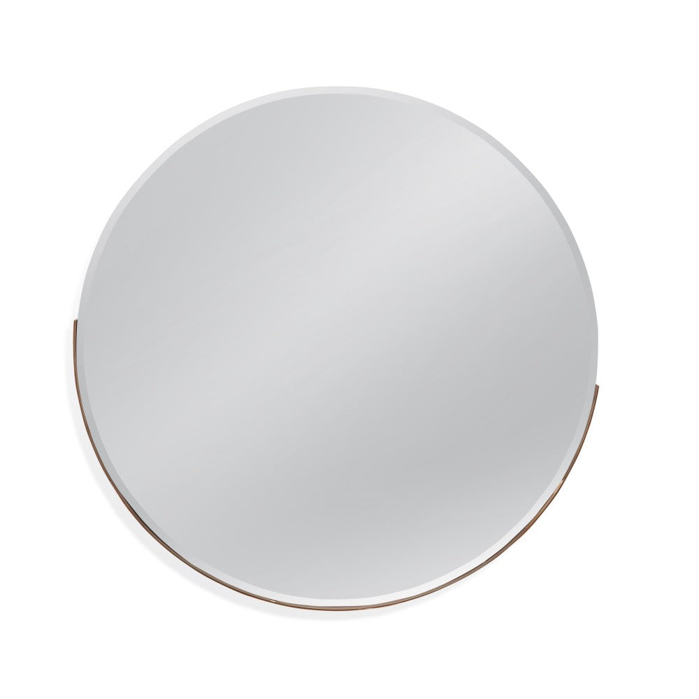 The Social Wall Mirror is a sleek round mirror with a rose gold raised frame and black edging to the clear glass mirror.