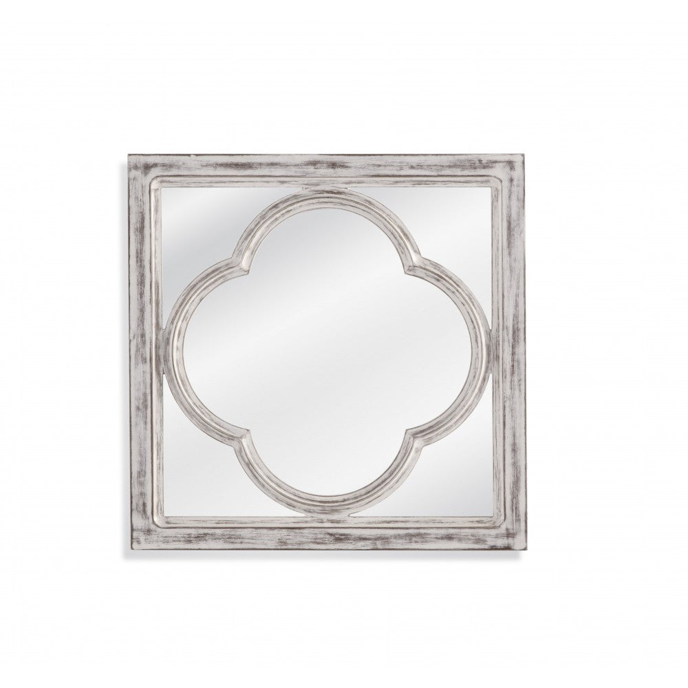 The Sutter Wall mirror incorporates the popular quatrefoil design overlaid on clear mirror. It is finished in distressed white and makes a statement wall hung as multiples.
