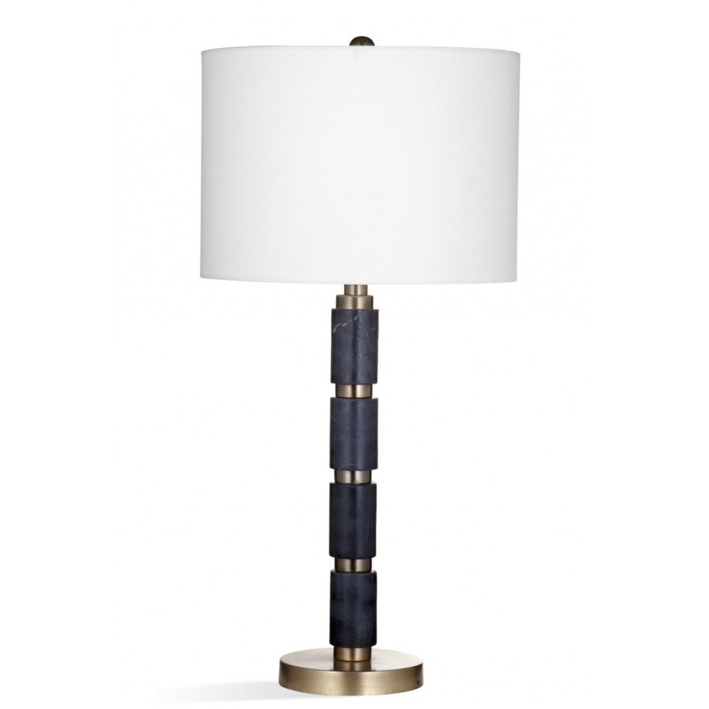 The combination of black marble with Gray veining is featured in the Ebeniste Table Lamp with brushed antique brass accents. This metal and marble lamp is capped off with a white cotton drum shade.