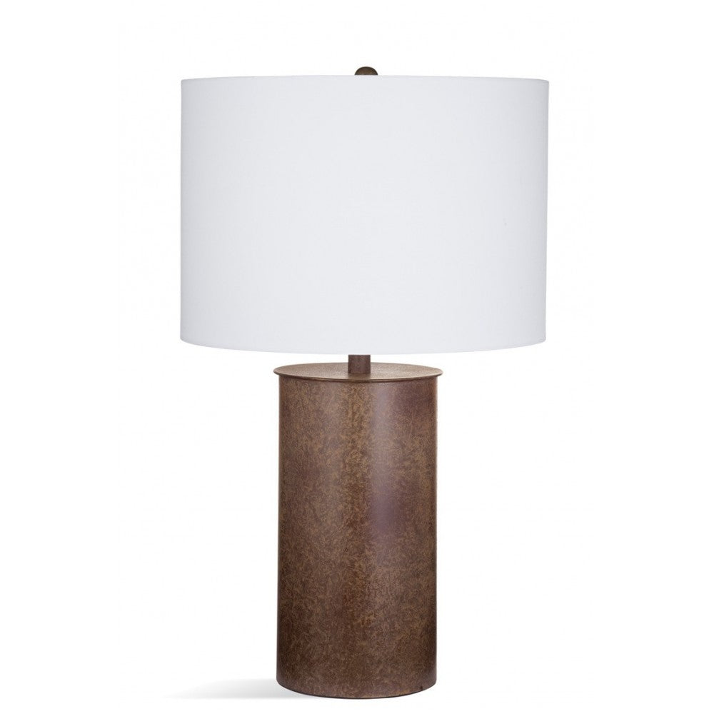 The Ethan Table Lamp features a faux painted technique of warm brown earth tones and brass highlights with a white linen drum shade. The lamp base is barrel shaped with a top lip.