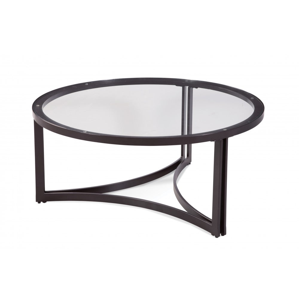 The Trucco Round Cocktail Table with nester features an angular double metal base and glass top. Adjustable floor levelers.