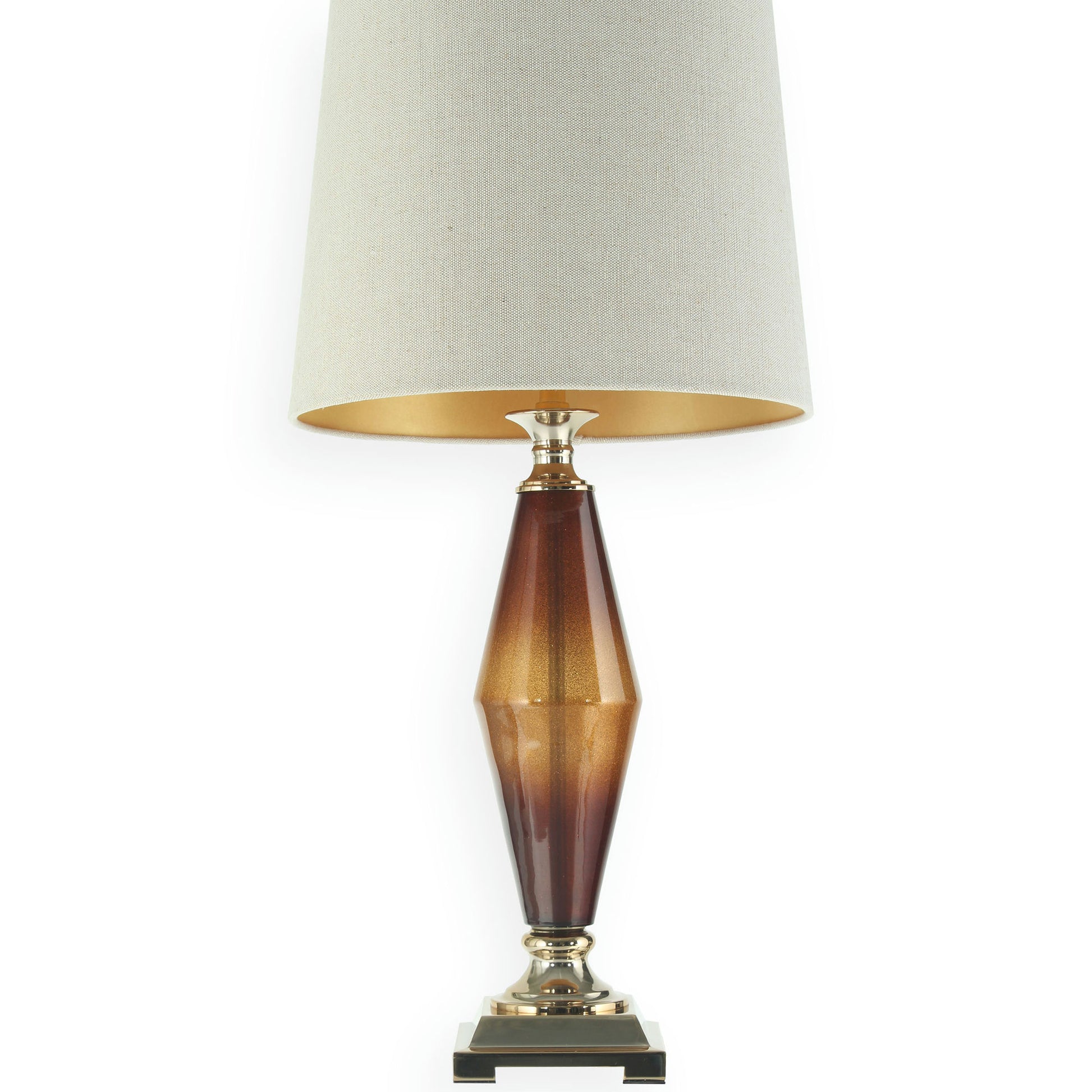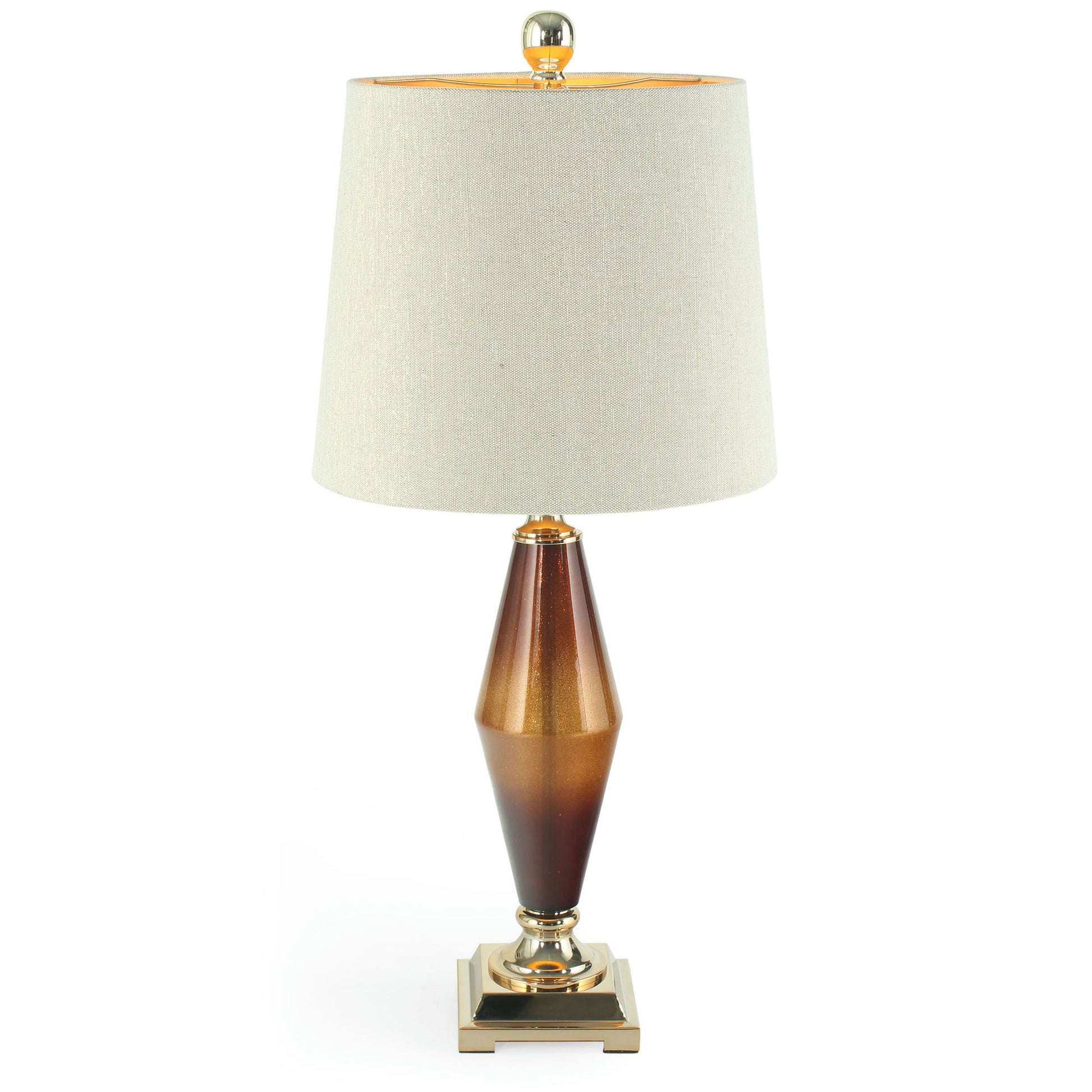 This table lamp gives a vintage feel with a modern twist with it's slender silhouette and two tone gold and brown body. It features a brushed gold base with a gold lined linen shade.