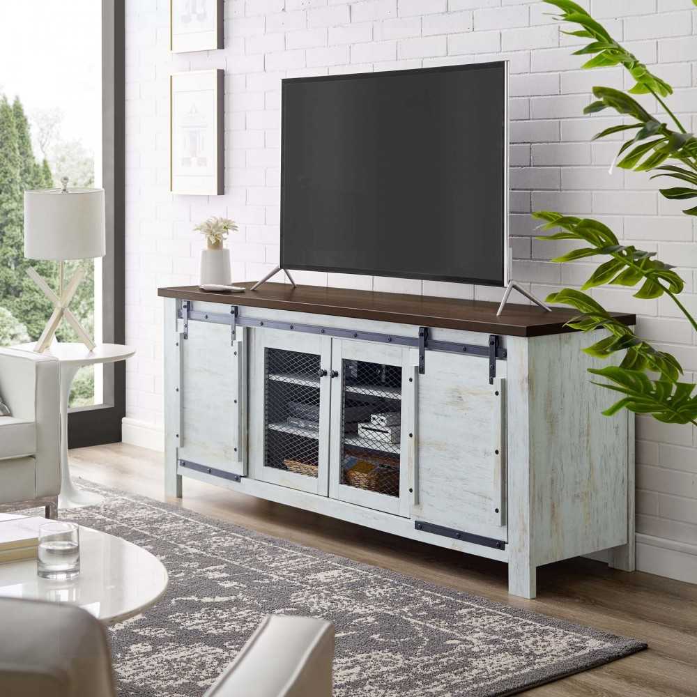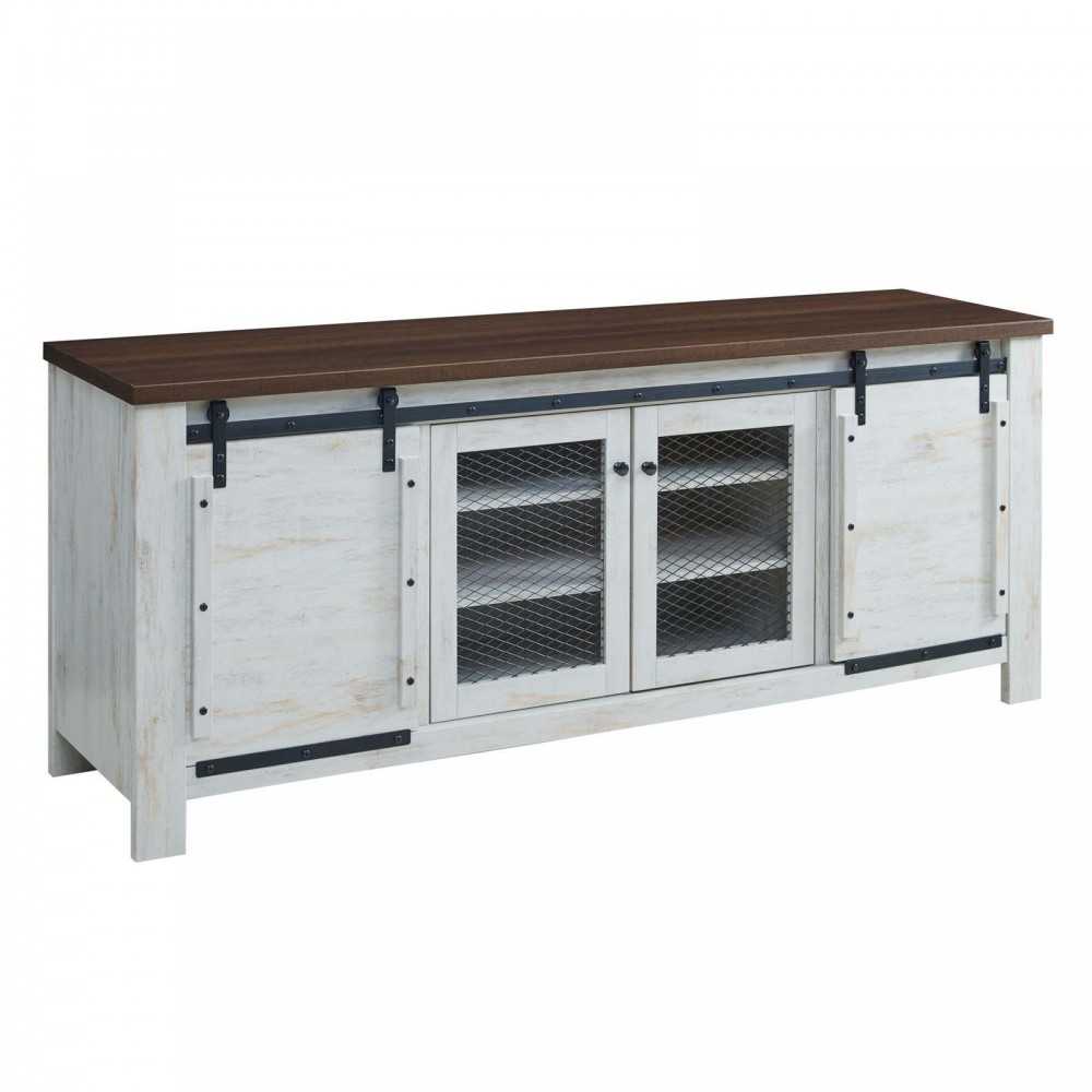 At 71" long, this entertainment console accommodates flat screen TVs up to 68" wide. This farmhouse-inspired TV stand is made of durable particleboard with wood-grain veneer and comes with two sliding doors, and two hinged mesh front doors, for versatile hideaway storage. A stylish anchor, Bennington is also perfect for use as a sideboard, display stand, credenza, and storing and serving buffet table in the living room, entryway, or dining room.