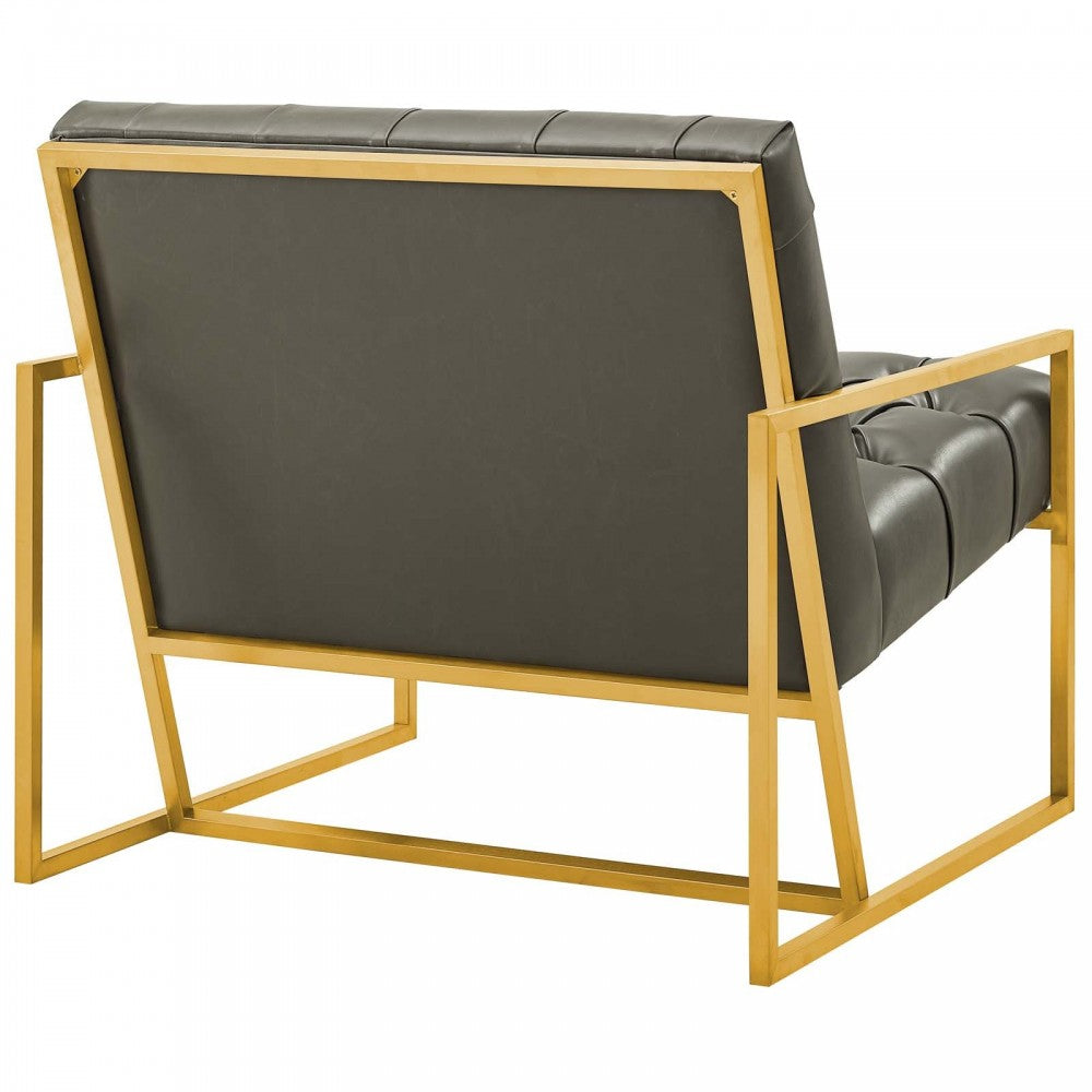 Welcome leisure time with the artfully designed Bequest Accent Lounge Chair. Boasting a striking gold stainless steel metal frame, upholstered in antique faux leather with deep button tufting with plush dense foam padding, Bequest elevates home and apartment decor with its glam aesthetic, sleek profile, cozy comfort, and ergonomic support. Chair Weight Limit: 331 lbs. Comes Fully Assembled.