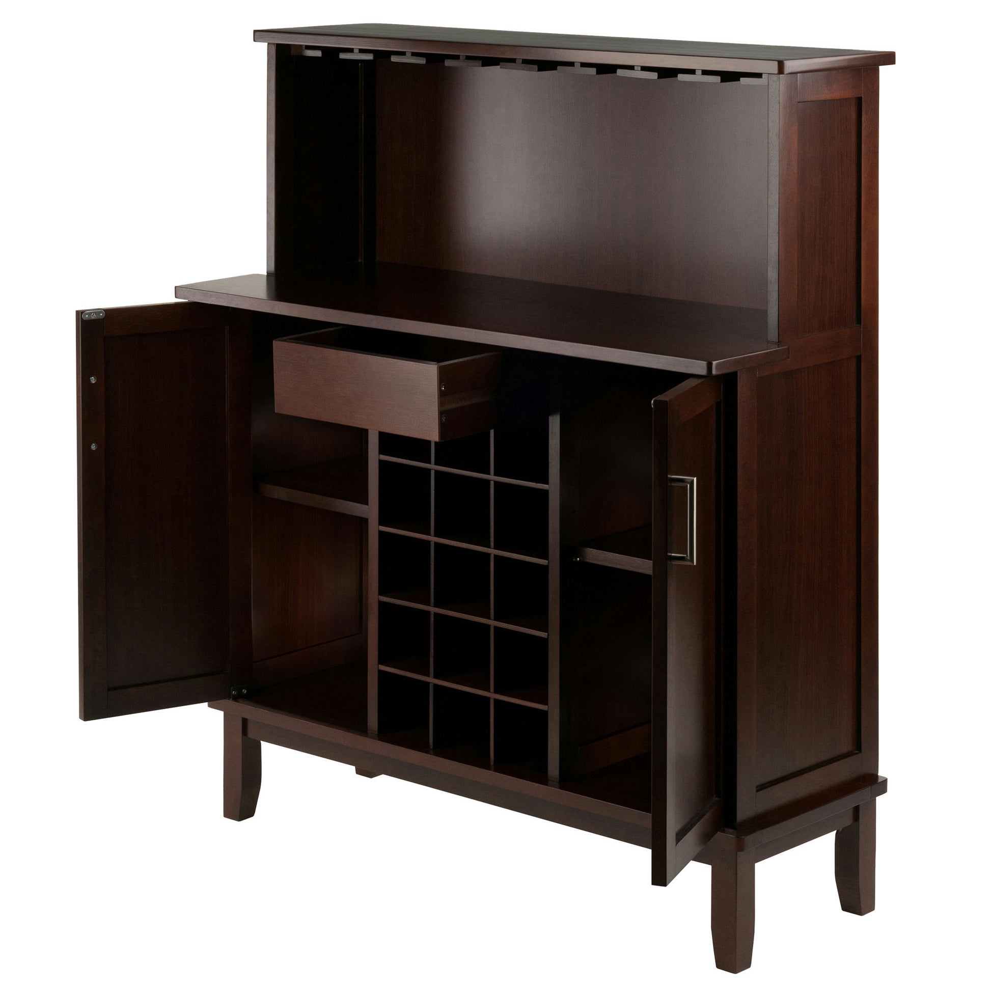Entertain in style with the Beynac Wine Bar. The bar's tabletop is great for mixing drinks or preparing appetizers, and your glasses are within easy reach in the unit-wide stemware rack built into the top cupboard. Two side cabinets, each with an adjustable shelf, provide additional storage along with the 15-bottle wood wine grid. A middle drawer offers a handy place for bar accessories. Made of solid and composite wood in a rich Cappuccino finish, this handsome, well-crafted piece will make entertaining a pleasure.
