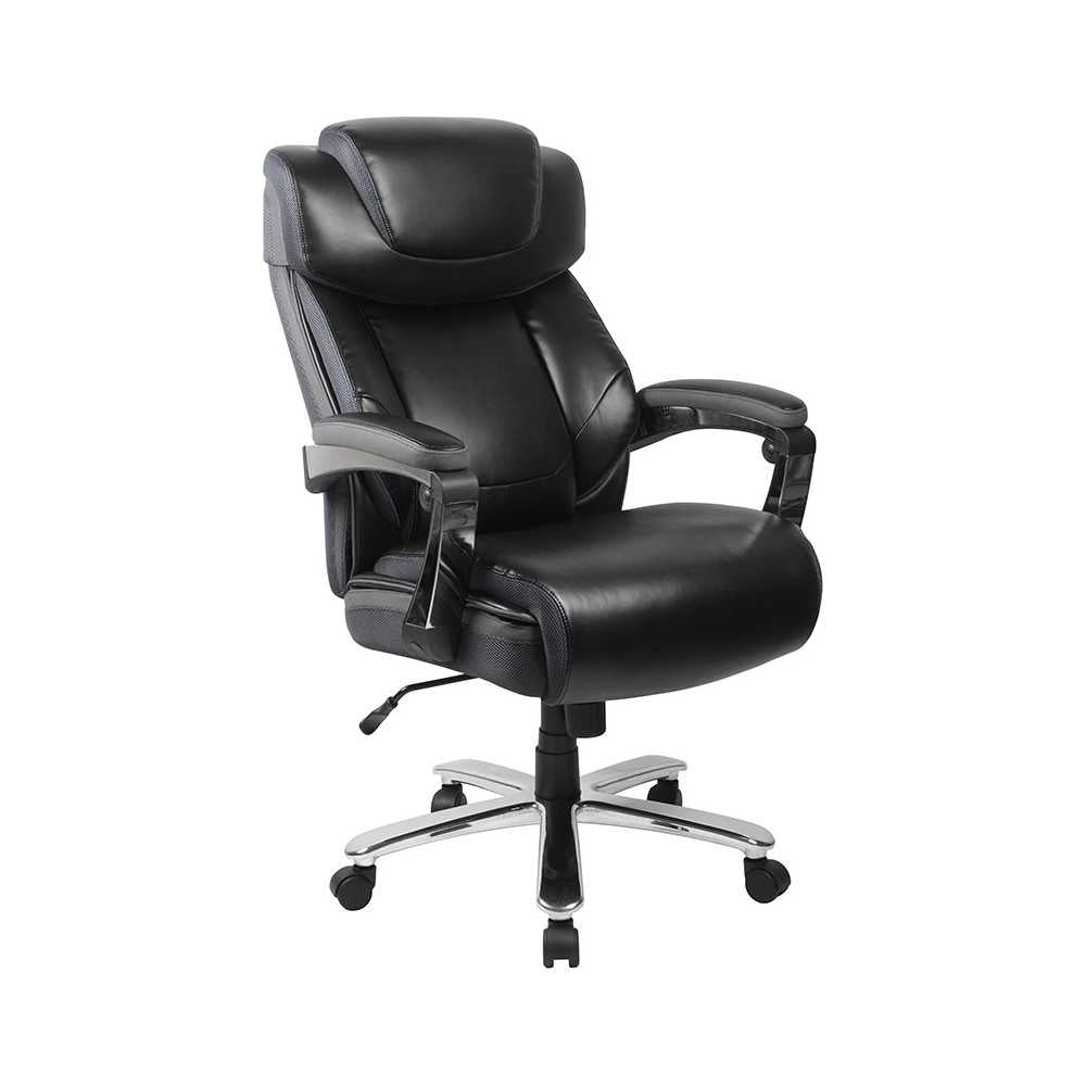 If your job or hobby requires you to sit for long stretches of time having the right chair is priceless. The thick, plush padding, black LeatherSoft upholstery and adjustable headrest featured in this Big & Tall executive swivel office chair are a must have. Big & Tall office chairs are designed to accommodate larger and taller body types. This chair has been tested to hold a capacity of up to 500 lbs., offering a broader seat and back width. High back office chairs have backs extending to the upper back for greater support. The high back design relieves tension in the lower back, preventing long term strain. The included headrest will take the pressure off of your neck while leaning back. The tilt lock mechanism offers a comfortable rocking/reclining motion. The free rein motion is great for taking a quick break from typing to answer phone calls and relax. The waterfall front seat edge removes pressure from the lower legs and improves circulation. Chair easily swivels 360 degrees to get the maximum use of your workspace without strain. The pneumatic adjustment lever will allow you to easily adjust the seat to your desired height. The chrome base adds a stylish look to complement a contemporary office space. [GO-2223-BK-GG]
