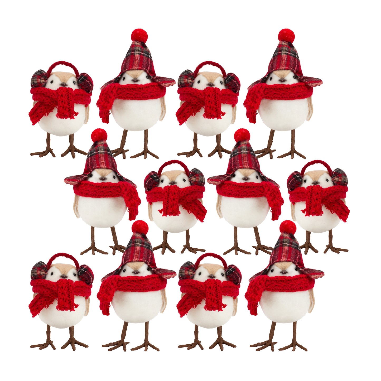 Add a whimsical touch of nature to your holiday decor with this beautiful set of Bird with Scarf and Hat Figurines. Featuring two assorted designs and twelve total pieces, the bold red colors paired with the cute scarf and hat accents is the perfect combination to create a stunning Christmas display. The quality foam and polyester composition is sure to last for seasons to come. Display the pieces together to make a statement, or display them alongside your other holiday decor to add character to the space.