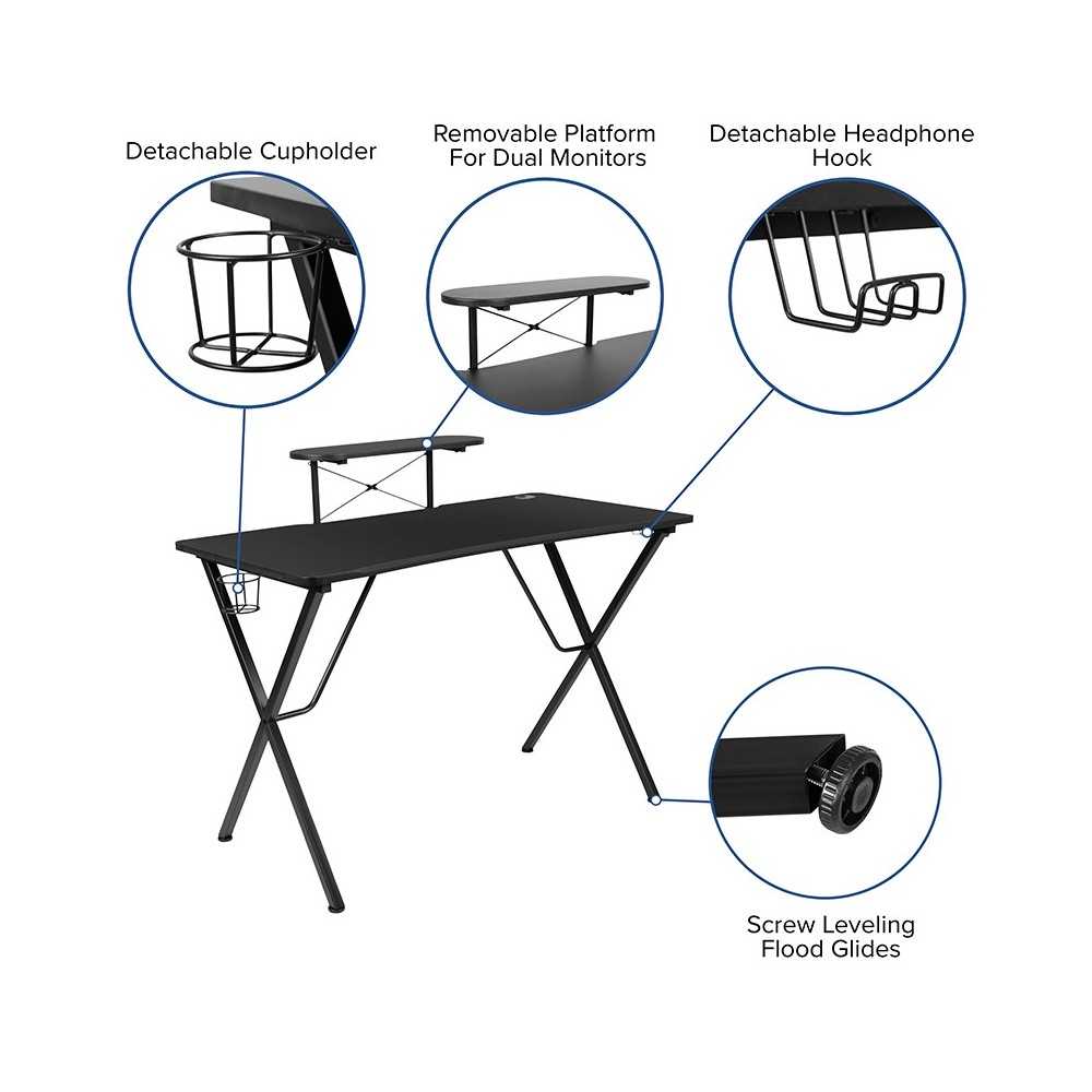 Let the games begin on this gaming desk and chair set. Not only cool to look at but the raised platform keeps your PC monitor at eye level, reducing neck strain. The black top gamers table has a grommet for cable management, a detachable cup holder and headset holder to keep you in game mode. The racing game chair have flip-up arms to comfortably rest your arms on while handling the controller or flip-up to slide under the desk. Be true to the gaming experience with a desk and chair combo designed for gaming systems. If you need more desk space, remove the platform to accommodate dual monitors. Use the cup holder to prevent beverages from spilling on your pc gaming keyboard. The comfortably padded ergonomic gaming chair has a full swivel cylinder and adjusts with the pneumatic lever. Tilt back with ease by pulling the lever outward, control the force needed to recline by turning the knob underneath the seat. Made for gamers, this gaming desk and chair bundle will get you on your way to leveling up. [BLN-X10RSG1031-WH-GG]