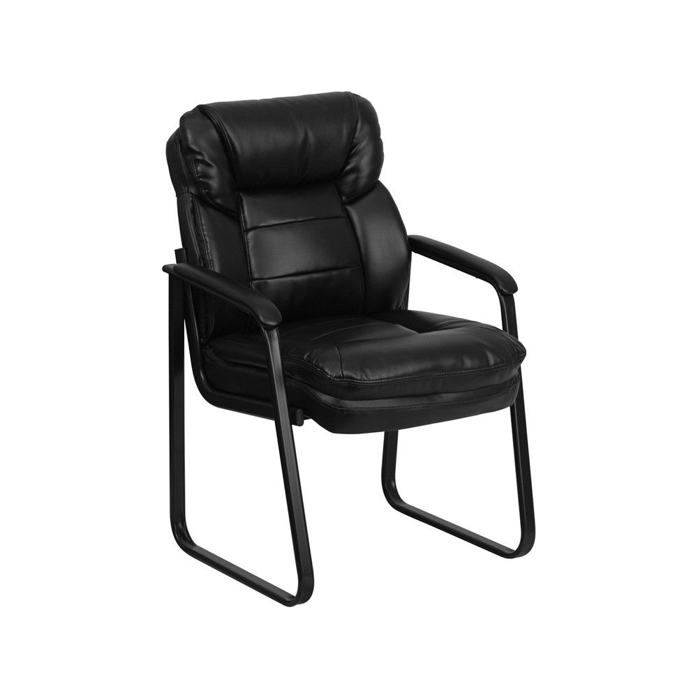 Ideal for any upscale or casual office setting, this LeatherSoft upholstered executive side chair with sled base serves as a stylish, yet comfortable solution for your facility's seating needs. LeatherSoft is leather and polyurethane for softness and durability. This reception chair is the perfect way to greet your patients or clients in your waiting room or reception area. The seat's contoured cushion and pair of curved arms also combine to offer unparalleled comfort. In addition to being able to complement any existing decor, the black metal frame is designed for maximum durability. Plus, a sled base with non-marring floor glides make the chair a great option for carpeted floors, as unlike traditional swivel or straight-legged options, its sled base won't snag and pull the floor's threads or fabrics. [GO-1156-BK-LEA-GG]