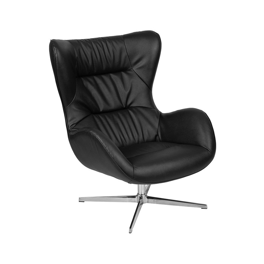 If modern, sophisticated and comfortable are the bywords of your design style then this wing chair is just what you've been looking for. This black LeatherSoft upholstered high back swivel accent chair would be a great look for your living room, home office or your professional office. LeatherSoft is leather and polyurethane for Softness and Durability. Horizontal stitching gives texture and depth to this side chair while the winged sides and CAL 117 fire retardant foam padded seat and back cradle your body and allow you to lounge in comfort. 360 degree swivel lets you easily converse with guests and allows you to reach multiple work surfaces without strain. This wing back chair has a 4 star alloy base that puts a bold modern twist on a retro look. The lightweight aluminum frame allows you to easily move this chair but is sturdy enough to hold up to 500 pounds to accommodate most users. Easily clean this leather accent chair with a solvent based cleaner, no water needed, to keep it looking new. Plastic protector floor glides will protect your flooring from damage and ensure smooth gliding. This comfy accent chair assembles in 10 minutes or less for quick and easy setup. [ZB-WING-BK-LEA-GG]