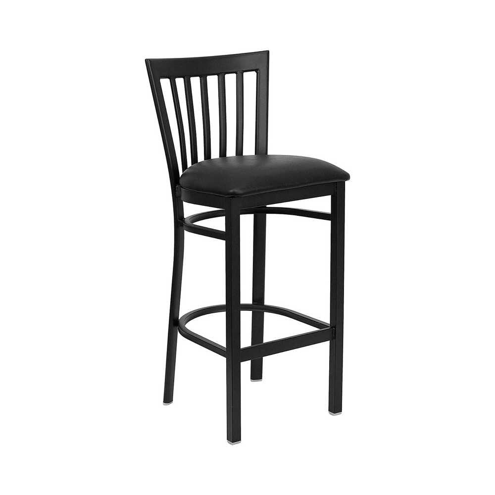 Create a first-rate dining experience by offering your patrons great food, service and attractive furnishings. Metal barstools are a popular choice for furnishing restaurants, pool halls, lounges, bars and other high traffic establishments. This school house back metal restaurant barstool is easy to clean, which is an important aspect for a business. Built to withstand everyday use in the restaurant and hospitality business, these dining stools will also look great in your home. The thickly padded black vinyl upholstered seat will keep guests comfortable. The frame is stabilized using two welded support bars, which includes a footrest. The floor glides help protect your floors and ensure smooth gliding. Use this bar height stool in your dining room or home bar to give your decor a fresh look. The simple and lightweight design of this stool is a must have, whether used in the home or your commercial business. [XU-DG6R8BSCH-BAR-BLKV-GG]