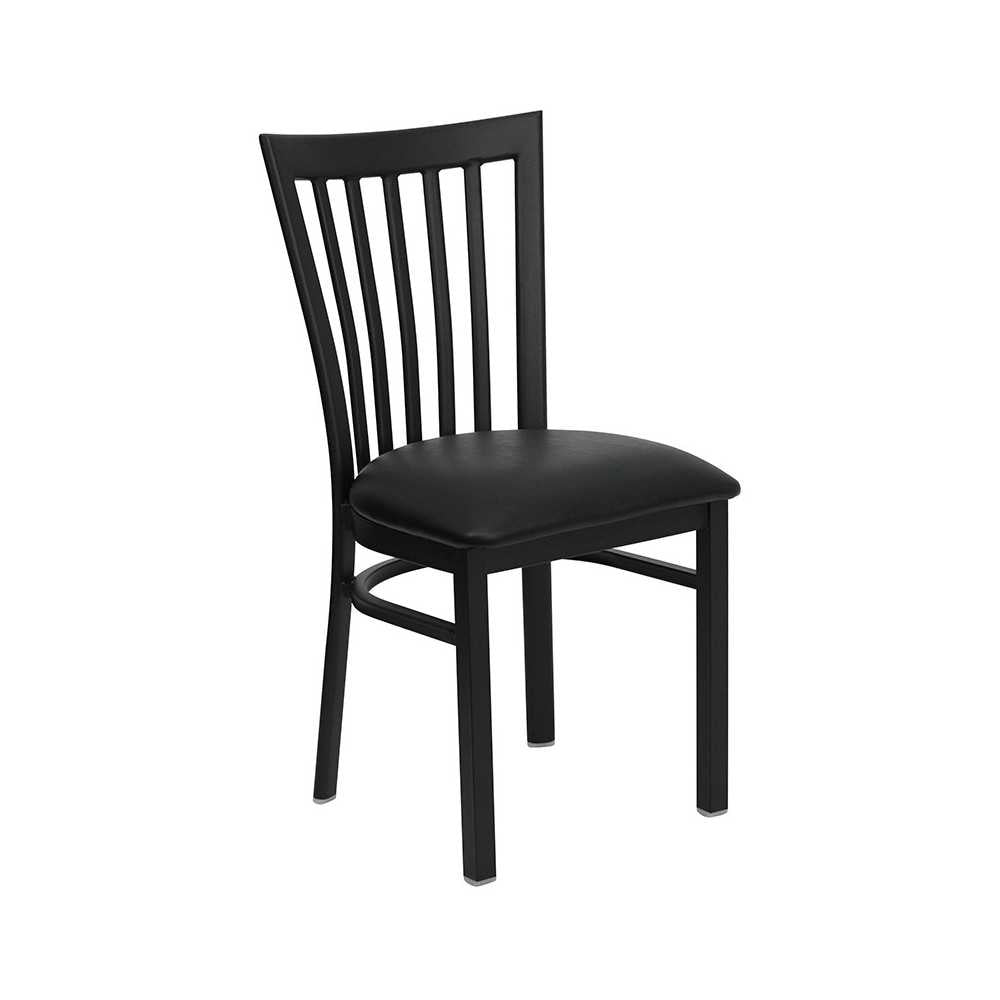Create a first-rate dining experience by offering your patrons great food, service and attractive furnishings. Metal chairs are a popular choice for furnishing restaurants, lounges, bars and other high traffic establishments. This dining chair is easy to clean, which is an important aspect for a business. Built to withstand the everyday hustle and bustle in the restaurant and hospitality business, these dining chairs will also look great in your home. The thick foam padded, black vinyl seat and school house back design will keep guests comfortable. The frame is stabilized using welded joint assembly and a curved support bar. The floor glides help protect your floors and ensure smooth gliding. Use this chair in your kitchen or dining room to give your decor a fresh look. The simple and lightweight design of this chair is a must have, whether used in the home or your commercial business. [XU-DG6Q4BSCH-BLKV-GG]