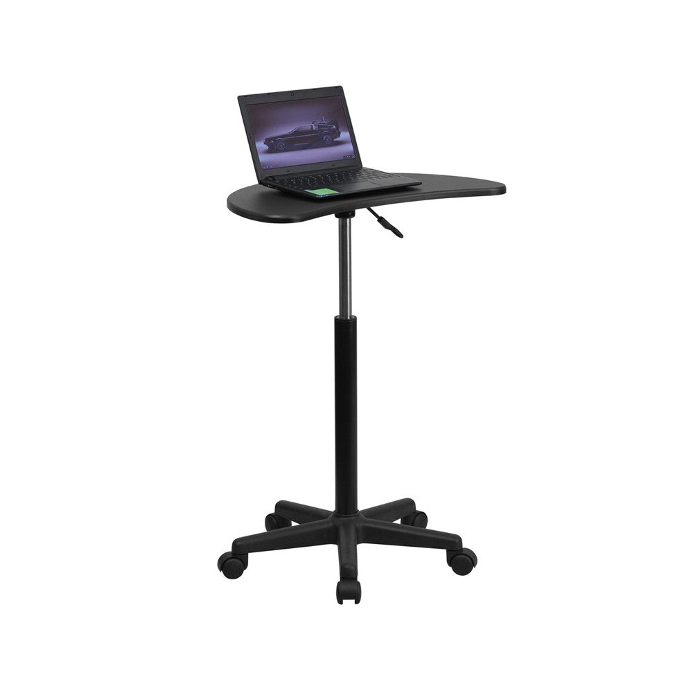 This handy little desk can be used for working on your laptop or as a speakers' lectern. It features a black laminate, half-moon shaped desktop that's height adjustable to allow you to use it while sitting down or standing up. Raise and lower the desktop using the pneumatic frame height adjustment lever. The heavy-duty, nylon base with dual wheel casters makes it easy to roll across the floor. The Mobile Computer Desk is an easy to move, versatile workspace on wheels for your home or office. [NAN-JN-2792-GG]