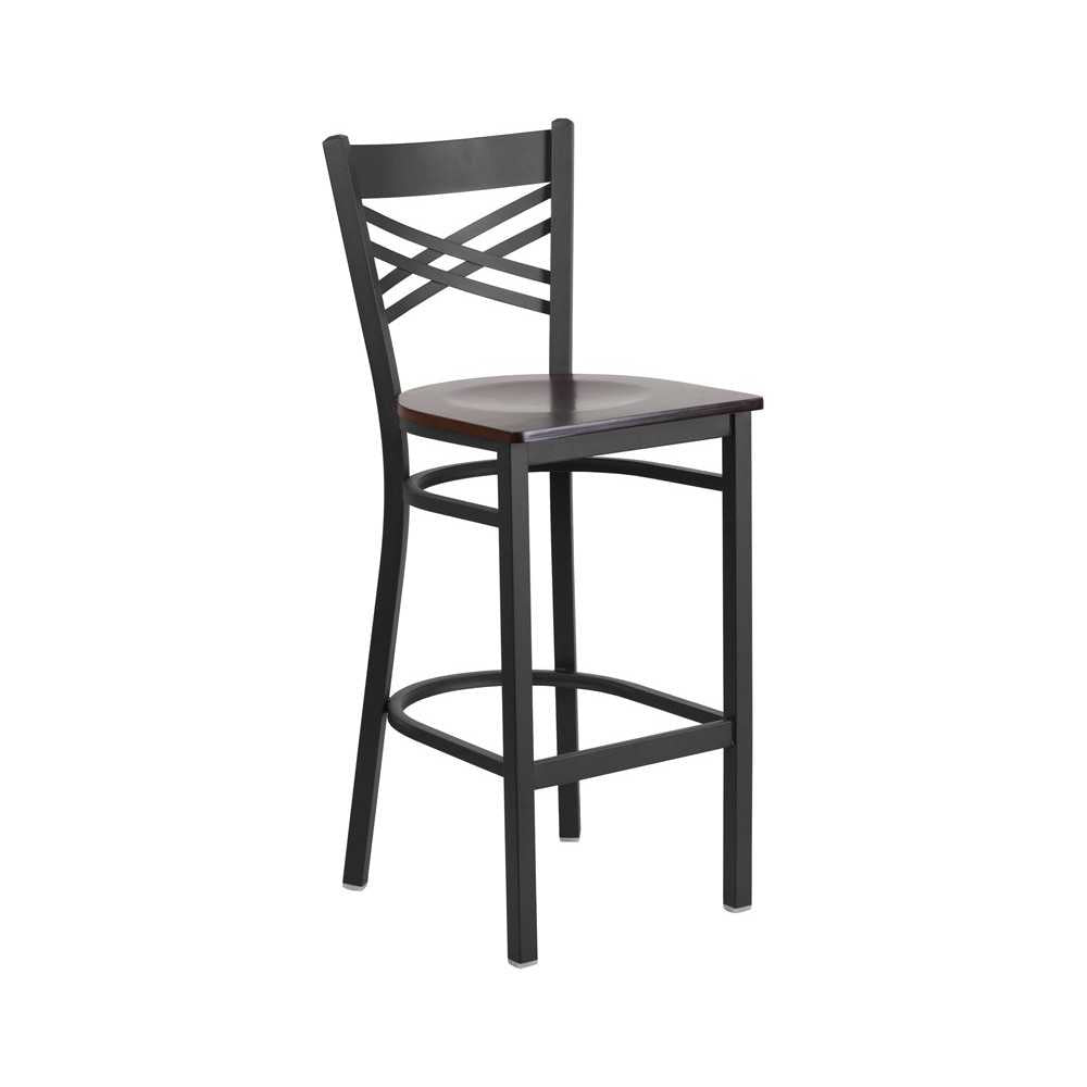 Black ''X'' Back Metal Restaurant Barstool - Walnut Wood Seat